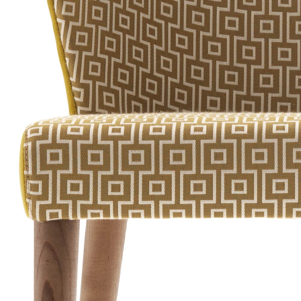 Modern design chair with solid wood legs in canaletto walnut; seat and back in cold-foamed polyurethane and fabric covering.
