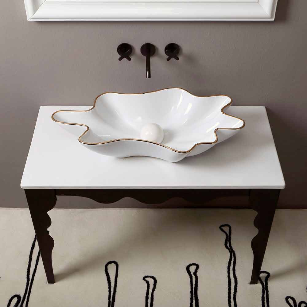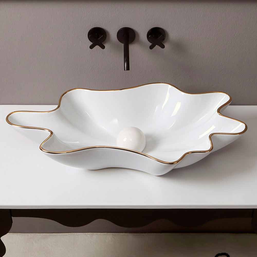 White ceramic countertop washbasin with gold edge made in Italy Rayan