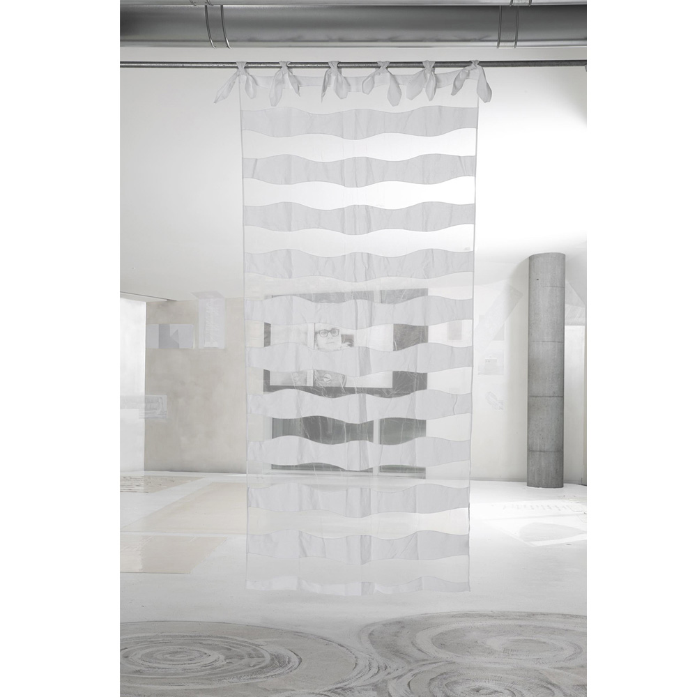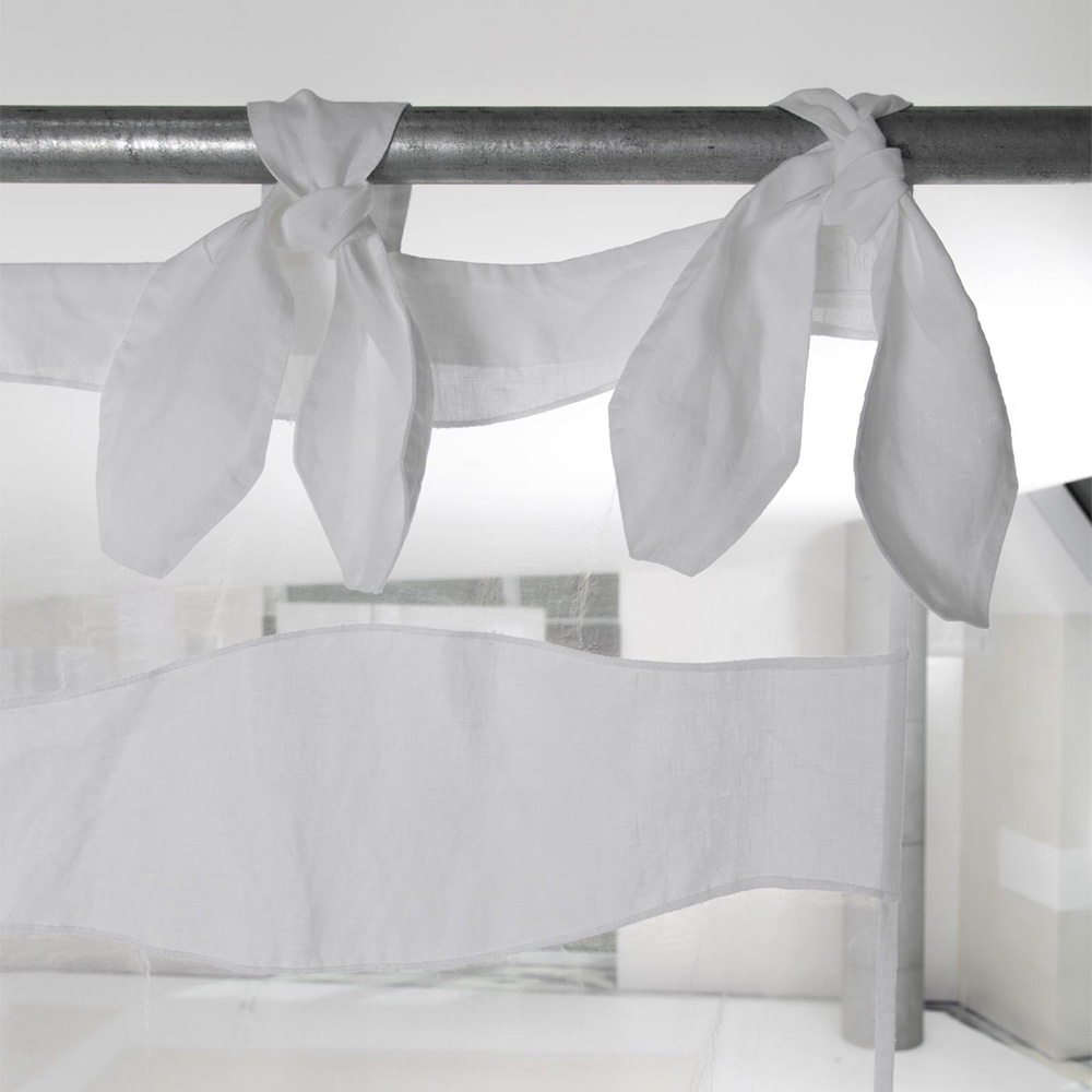 White linen and organza curtain with wave embroidery and lacing, handmade quality made in Italy.