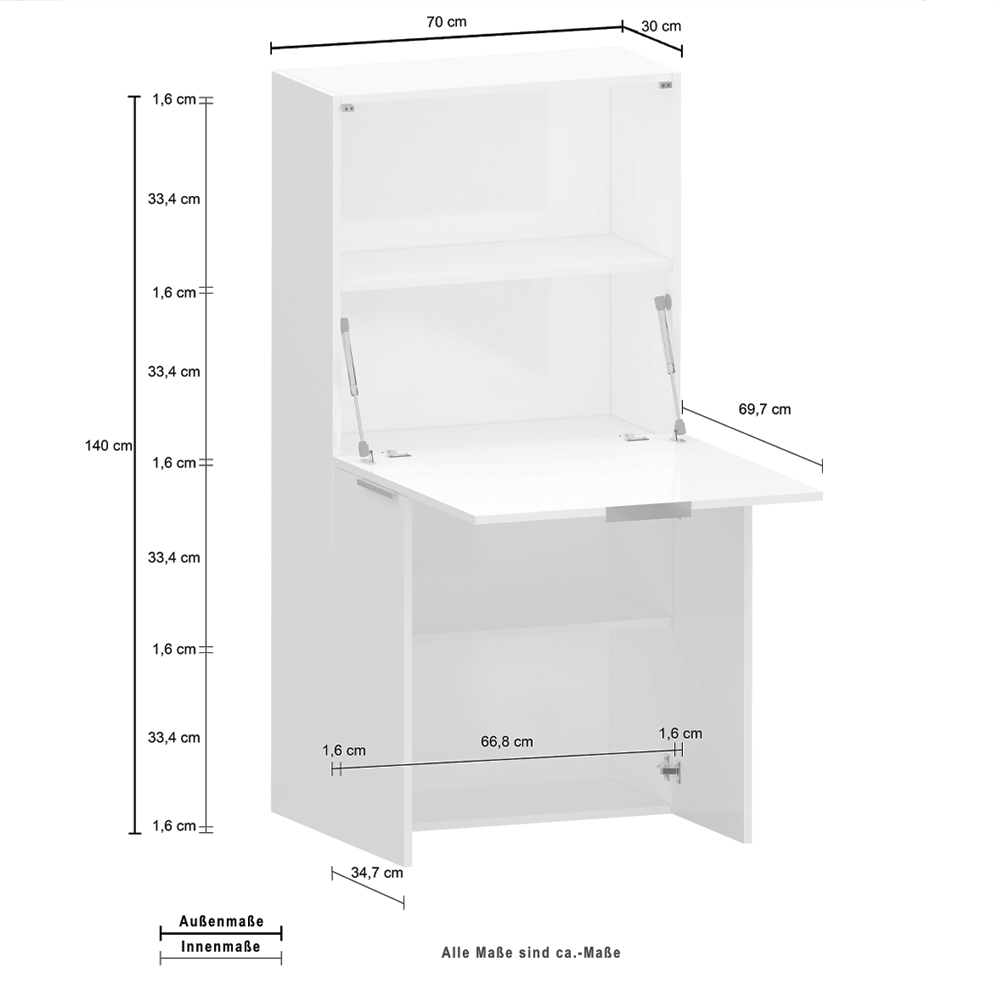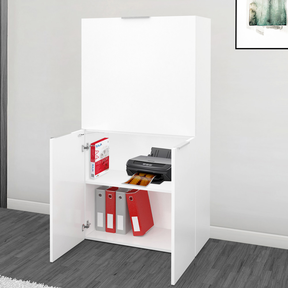 an upper flap door which also acts as a desk top when opened downwards through the practical use of a handle.