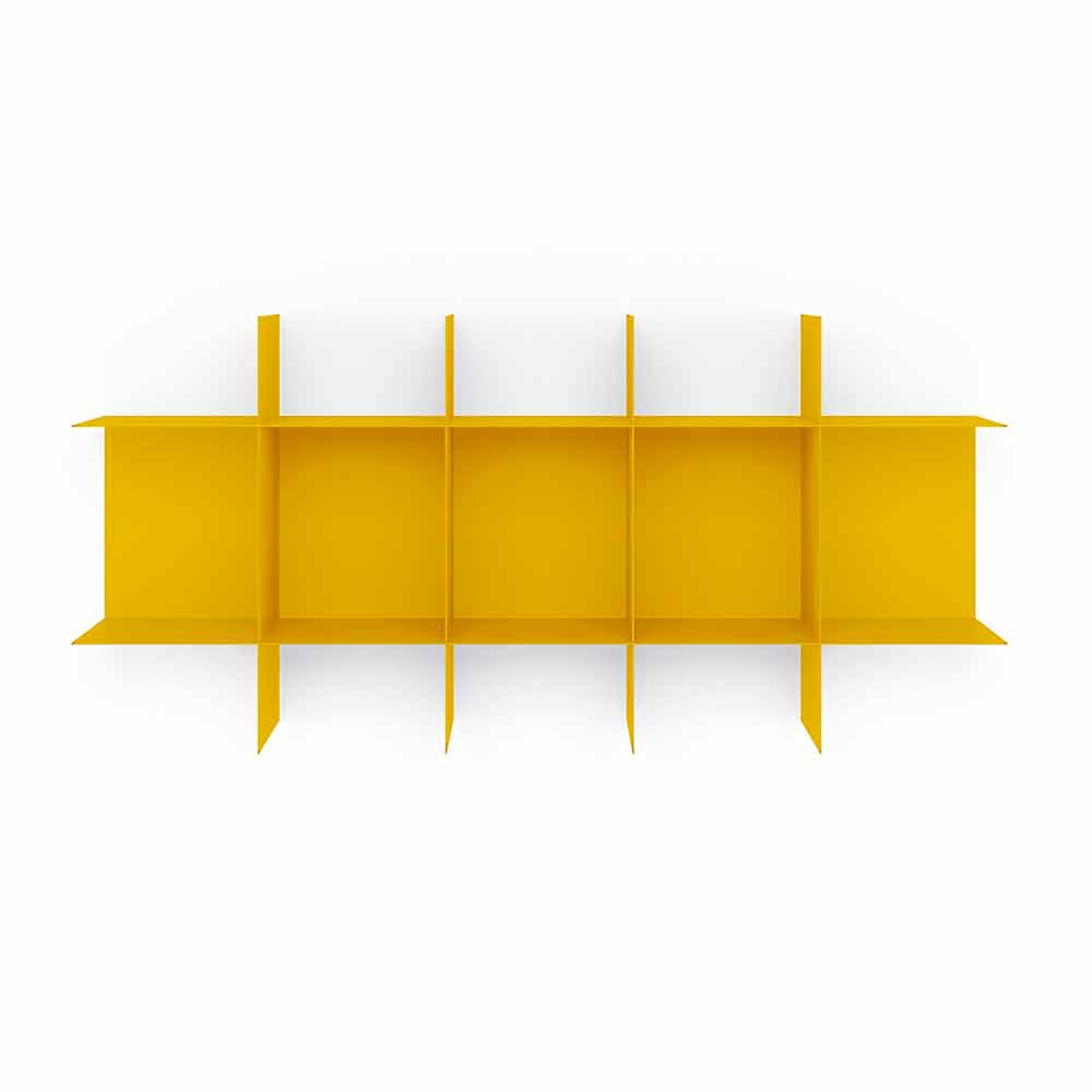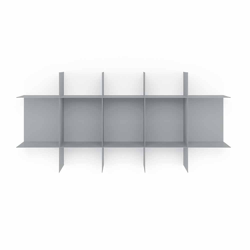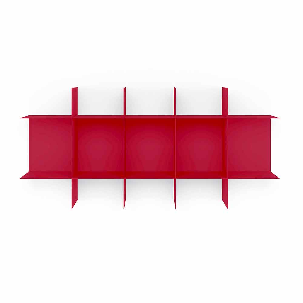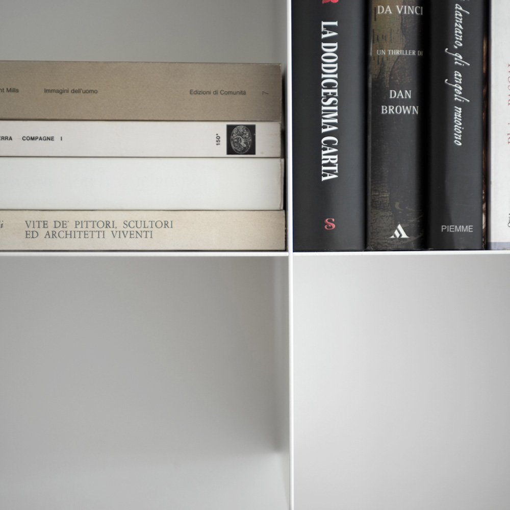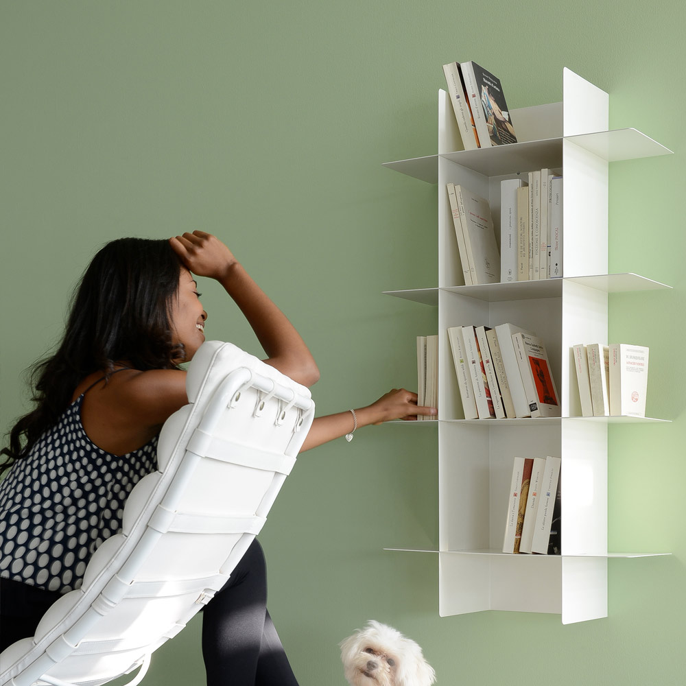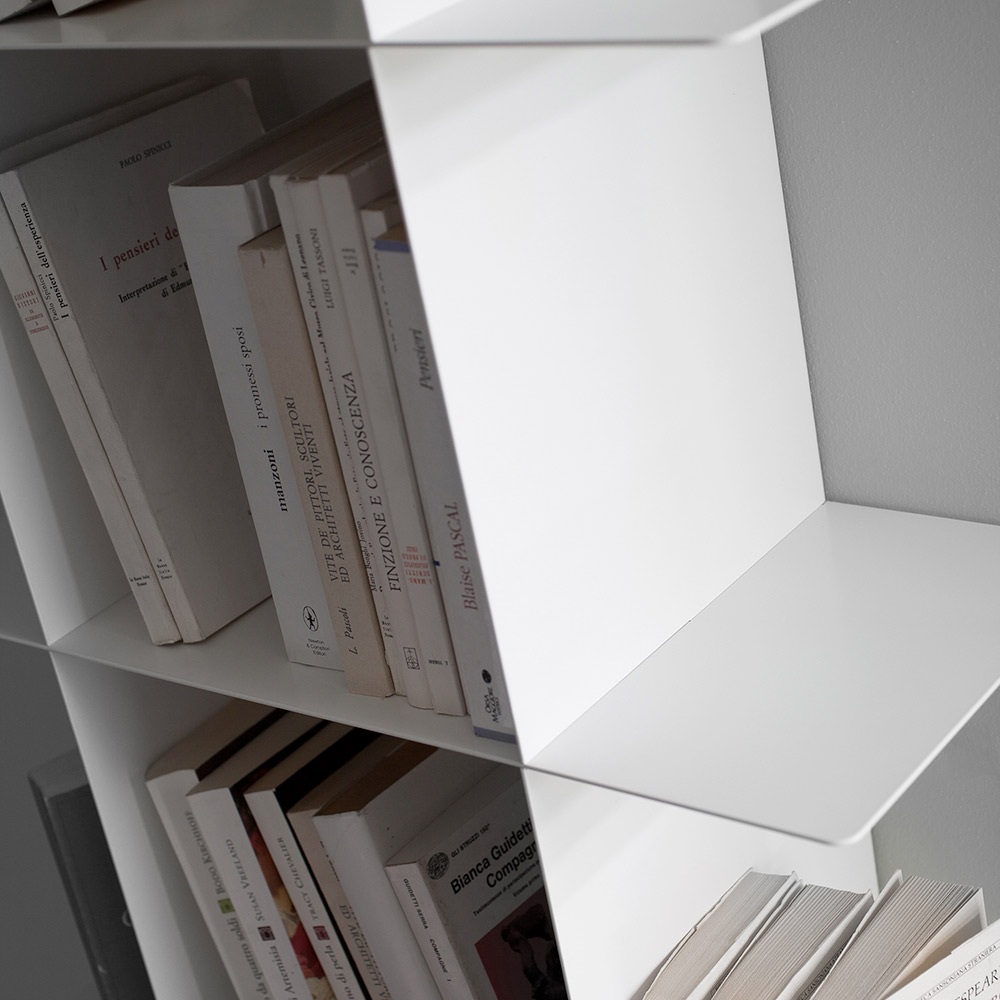 This modular steel bookcase consists of a central basic module to be fixed to the wall and four shelves that fit perfectly into the module forming a pattern of square compartments, with a geometric and contemporary design , elegant and refined in its simplicity.