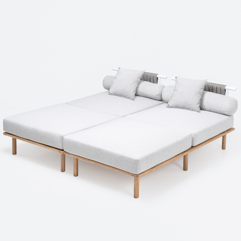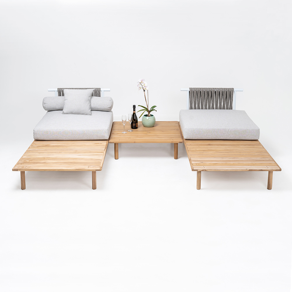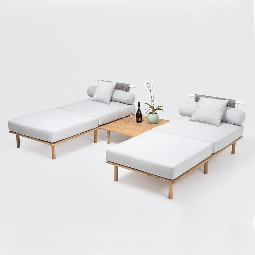 This modular garden set is the epitome of versatility and style . Designed to fit elegantly and functionally into any outdoor space, it is characterised by the combination of natural materials and contemporary design . Teak wood , known for its strength and durability, forms the solid base on which soft and inviting light grey cushions rest.