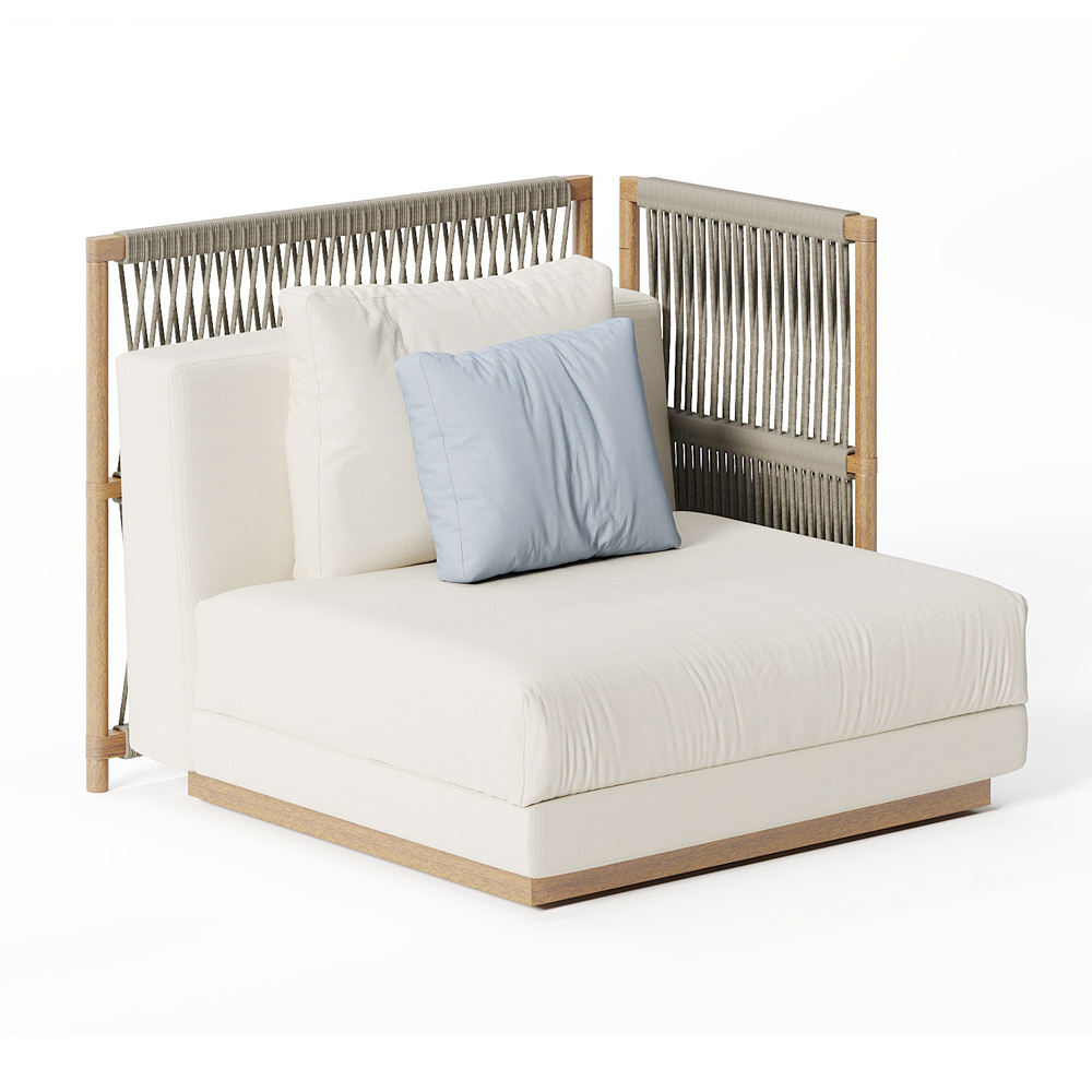 Modular garden sofa entirely made in Italy with seat and back cushions in padded fabric and structure in iroko wood and green rope weaving . The product consists of a low and deep seat and thanks to the large cushions it becomes an inviting and welcoming system designed to create a relaxed and informal atmosphere. This set is perfect for making any environment unique by offering the freedom to rewrite your living spaces with taste and style. Thanks to its simple and linear finishes, it guarantees elegance and refinement to any environment in which it is placed. The iroko wood structure, thanks to its weaving and decoration, recalls the artisan tradition of weaving and gives a touch of unique identity to the composition while remaining a purely decorative element. This structure can also be used as a freestanding partition boiserie.