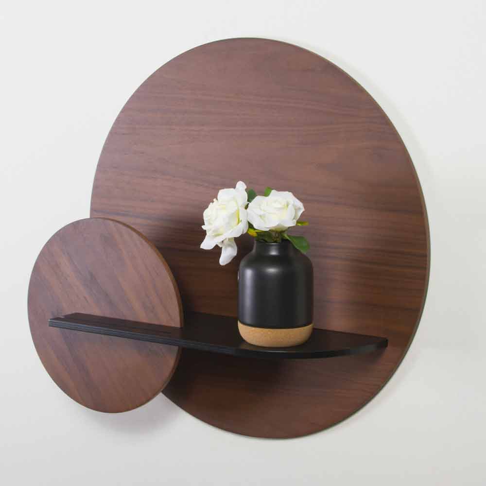 This shelf consists of 3 plywood panels, one of which in black stained ash finish fixed to the wall with a metal support that acts as a real support surface and two other vertically mounted round-shaped panels made in walnut finish , which they can be positioned in 8 different configurations allowing to obtain a customizable product according to tastes and needs. In order to further increase the functionality of this wonderful article, there is a practical cable hole positioned behind the smaller vertical panel, ideal for hiding any type of cable or charger.