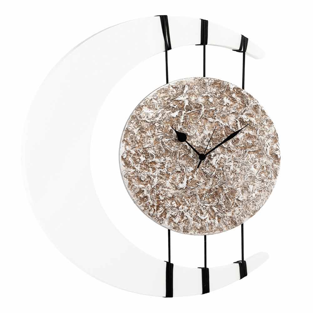 Moon-shaped designer wall clock Jilly, ivory lacquer and silver foil