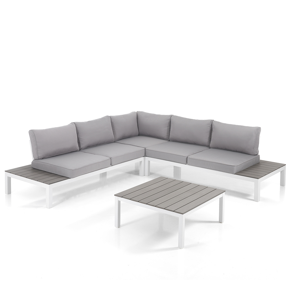 This corner sofa and garden table represents the quintessence of elegant relaxation and contemporary style. With its white frame and clean queues, the sofa offers a chic, modern contrast against the warm wood of the seating and table surface, creating a welcoming environment that is both inviting and aesthetically pleasing .
