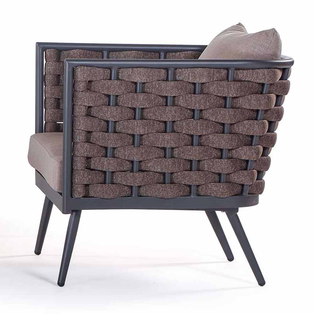 Outdoor armchair made with graphite finish painted aluminium structure and polyester rope weaving complete with seat and back cushions covered in brown acrylic fabric . A seat for outdoor environments that combines functionality and a pleasant aesthetic appearance, thus managing to offer a perfect furnishing solution for those looking for a product that is as comfortable and welcoming as it is elegant and capable of creating a wonderful harmony with the other elements of the furniture surrounding.
