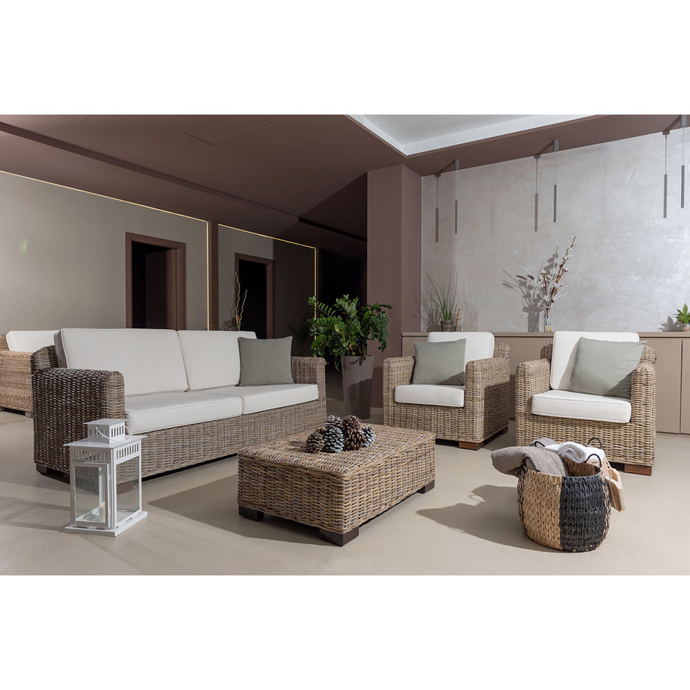 The armchair belongs to a whole collection characterized by the natural grey kubu with straight queues and a wide seat. Comfort and essentiality in a timeless style that takes shape thanks to the use of natural fibers that nature provides.