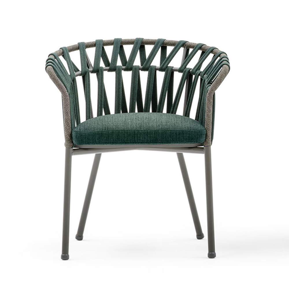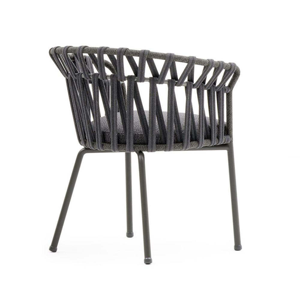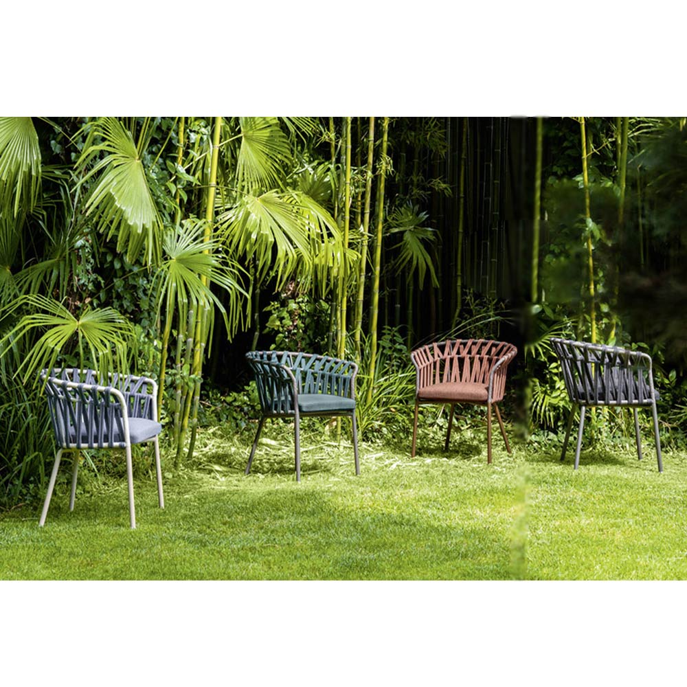 Outdoor armchair with woven backrest and aluminium base, luxury item.