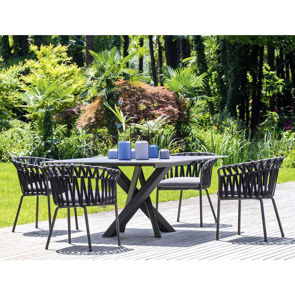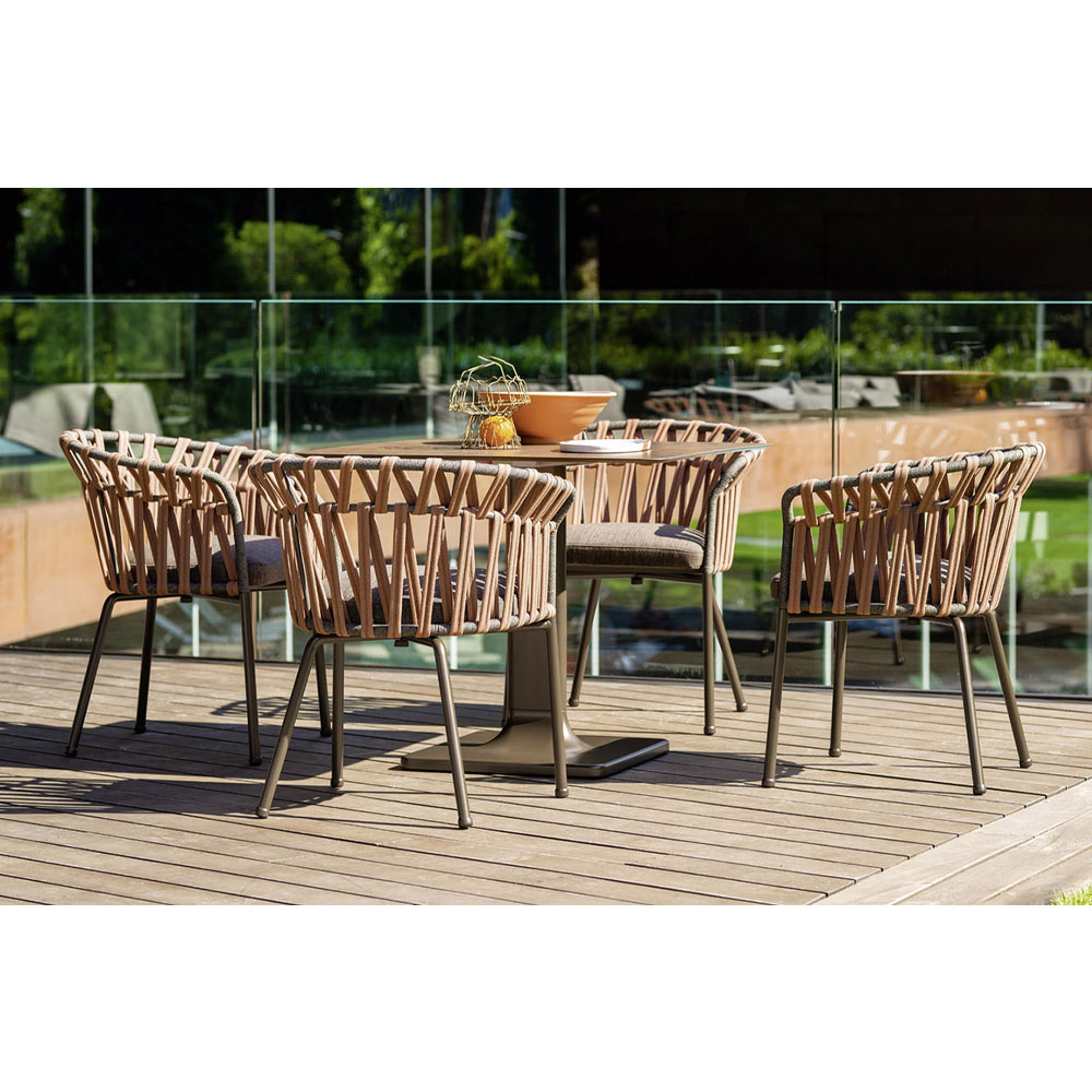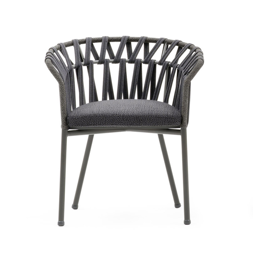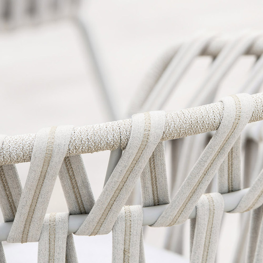 Outdoor armchair with woven backrest and aluminium base, luxury item.