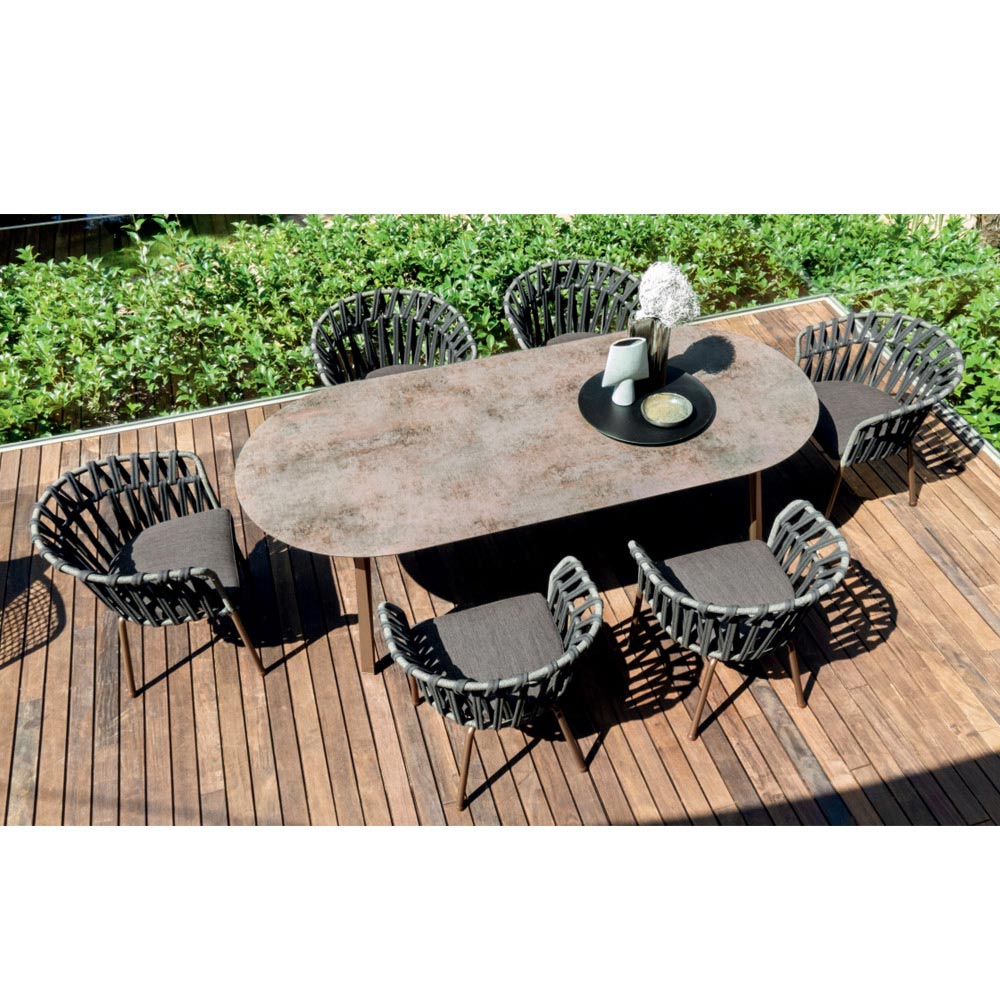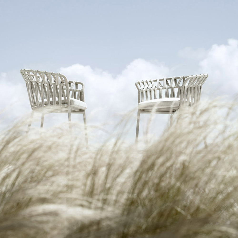 Its design is inspired by the elegant and light shapes of the corolla of a flower and is made unique by the weaving created following a particular geometric pattern that perfectly matches the delicate and enveloping shapes of the structure that welcome and relax. What is born is a fresh and innovative furnishing solution enriched by the wonderful refined nuances thanks to which the outdoor naturalness is transformed into contemporary elegance.