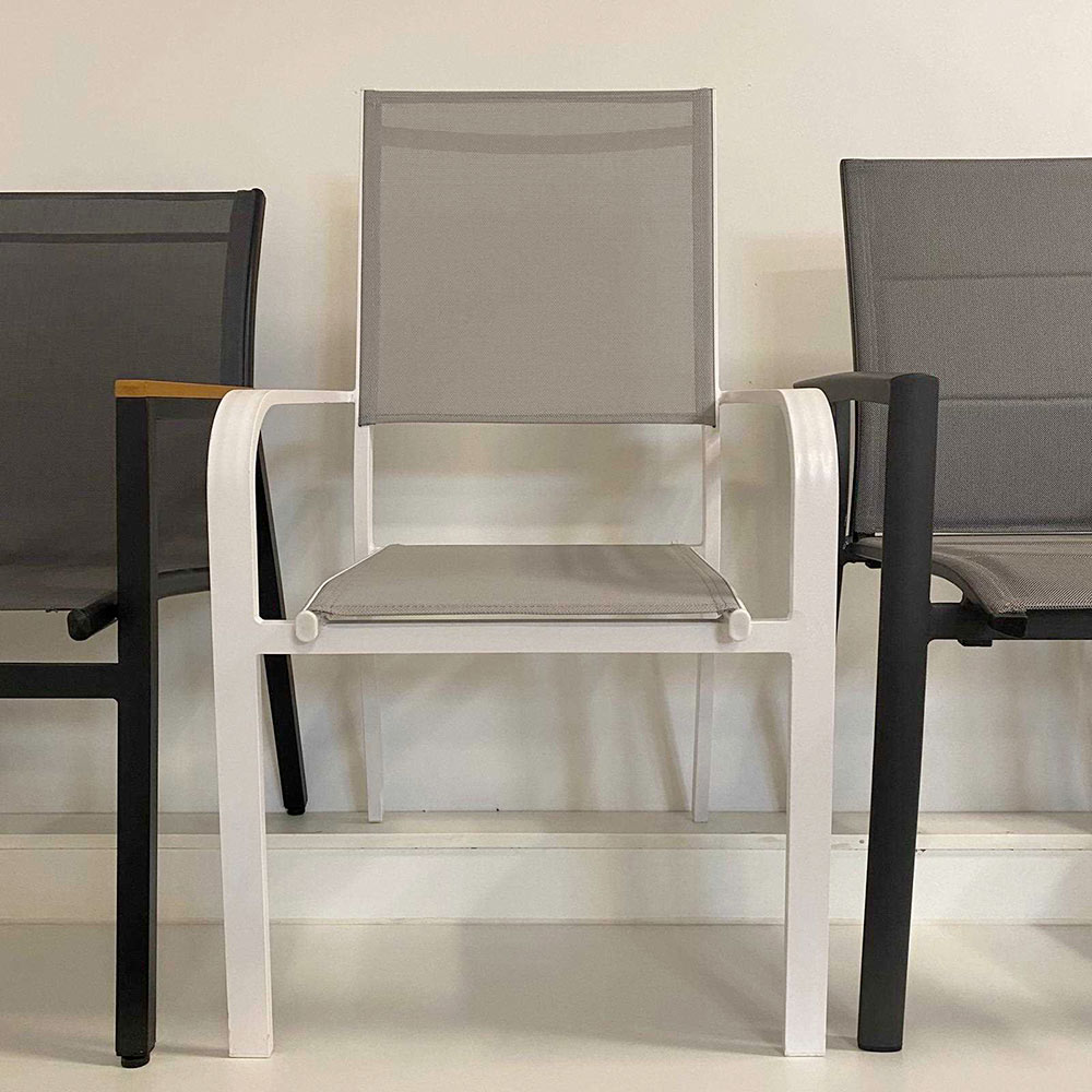 Garden armchair made with a white powder-coated aluminium frame, seat and backrest in light grey textilene.