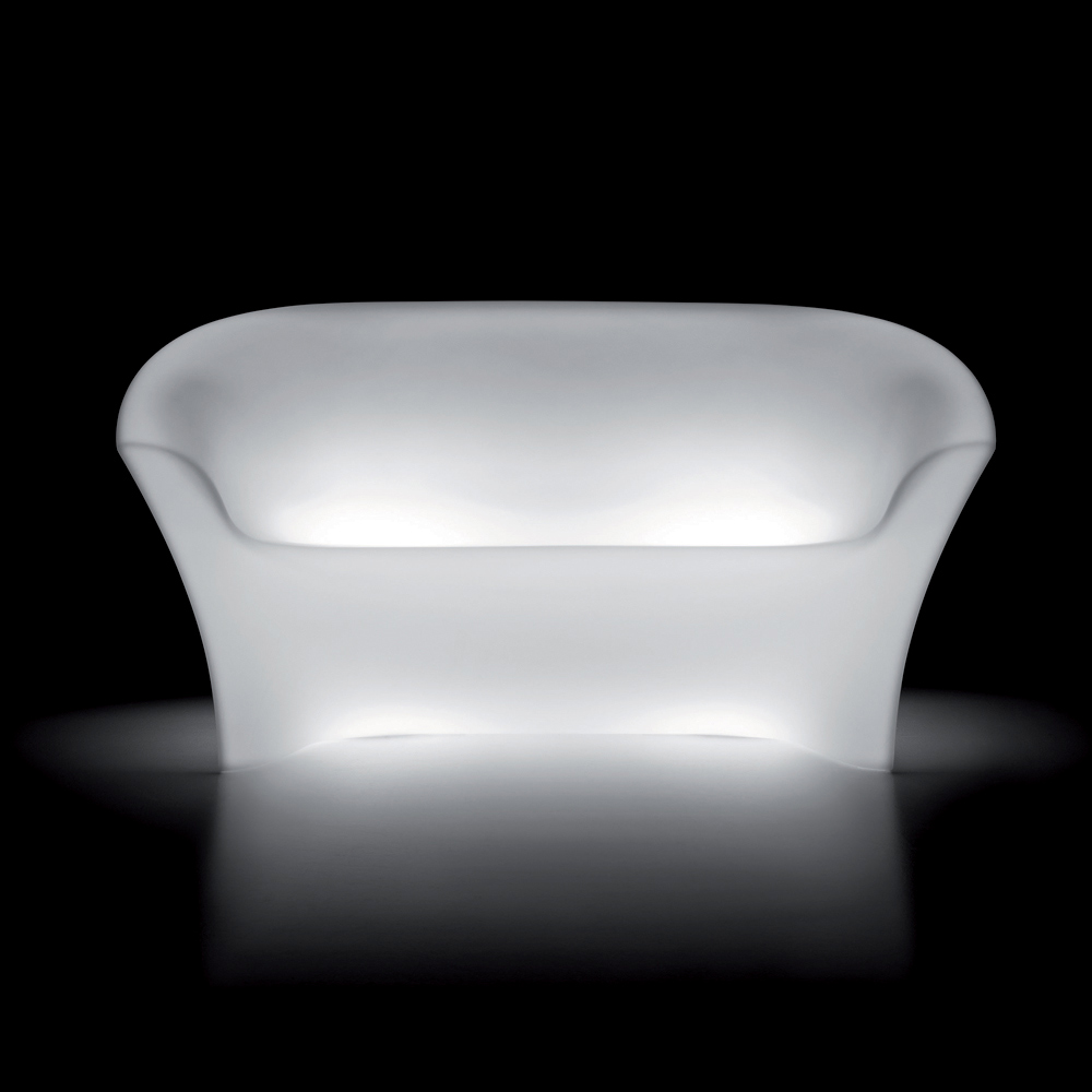 This outdoor sofa is characterized by light and delicate queues which together with the illumination given by the LED light, makes the product perfect for creating wonderful relaxation areas in any environment. Entirely produced in Italy, this item is made of polyethylene available in the opaque version characterized by excellent resistance to the sun, shocks and heat or in the resistant and bright lacquered version that allows you to create plays of light and reflections that become protagonists inside of the environment. Equipped with excellent stability and sturdiness, this sofa is perfect to complete the furnishing of modern and contemporary spaces with taste and style thanks to comfort and practicality. Complete with cold LED light kit which includes: 20W class A bulb, polycarbonate shell, 280 cm long black cable and splashproof plug.