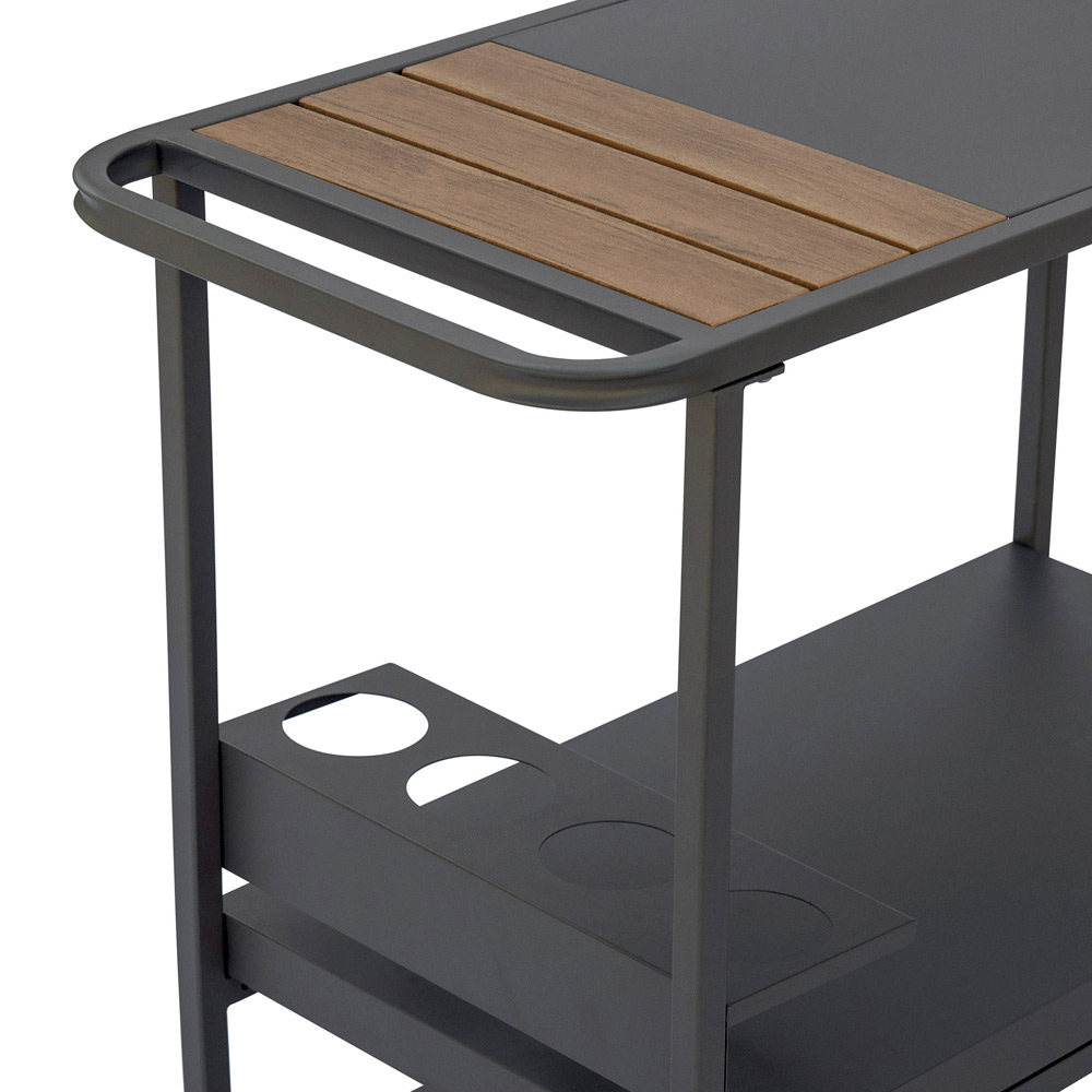 The top shelf with resin wood details adds a warm, natural touch to the modern design, creating a pleasant aesthetic contrast. The lower shelf and integrated bottle holder offer additional space for organizing drinks, glasses, and accessories, making this cart the perfect ally for lunches, aperitifs, or al fresco dinners.