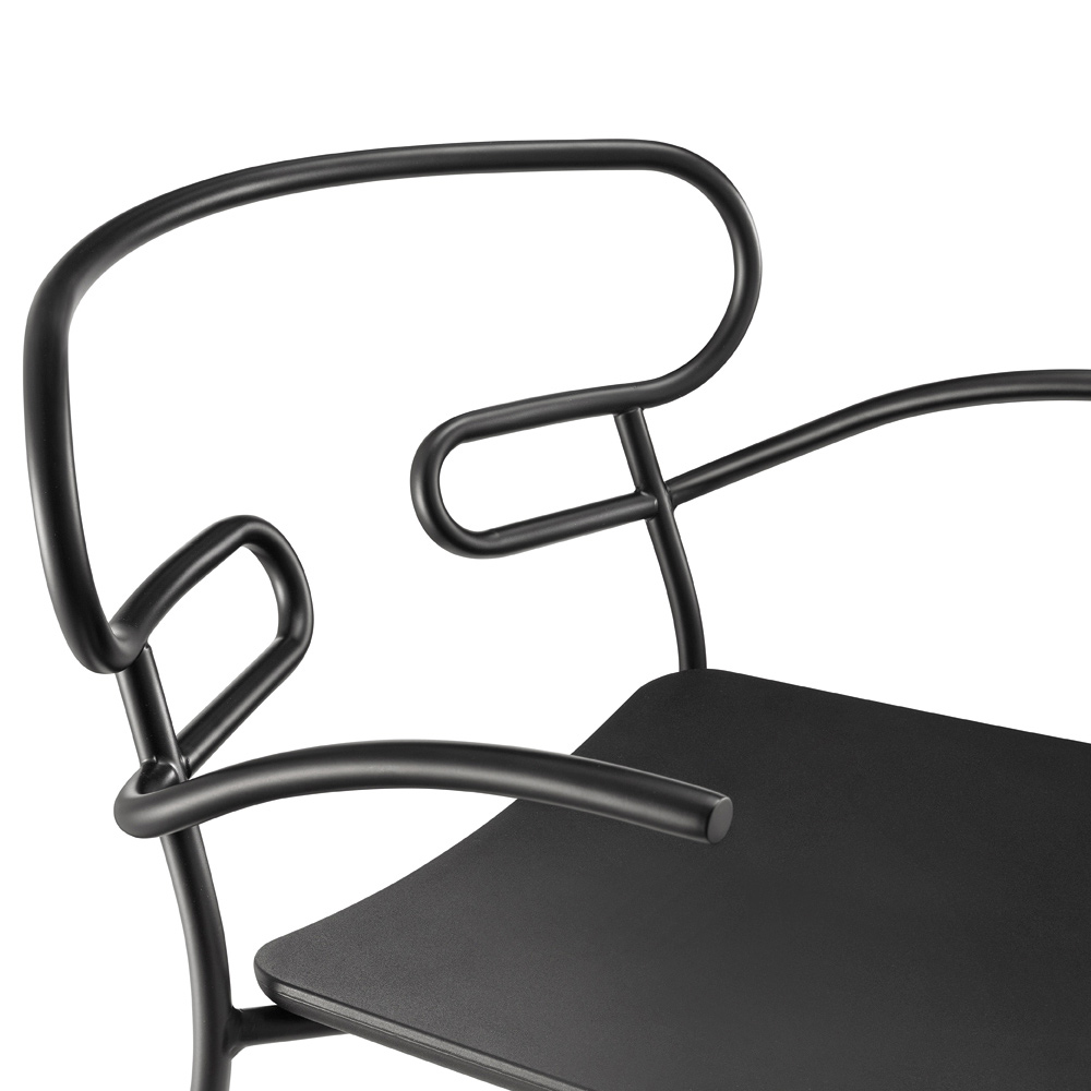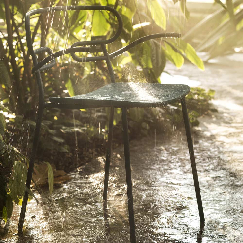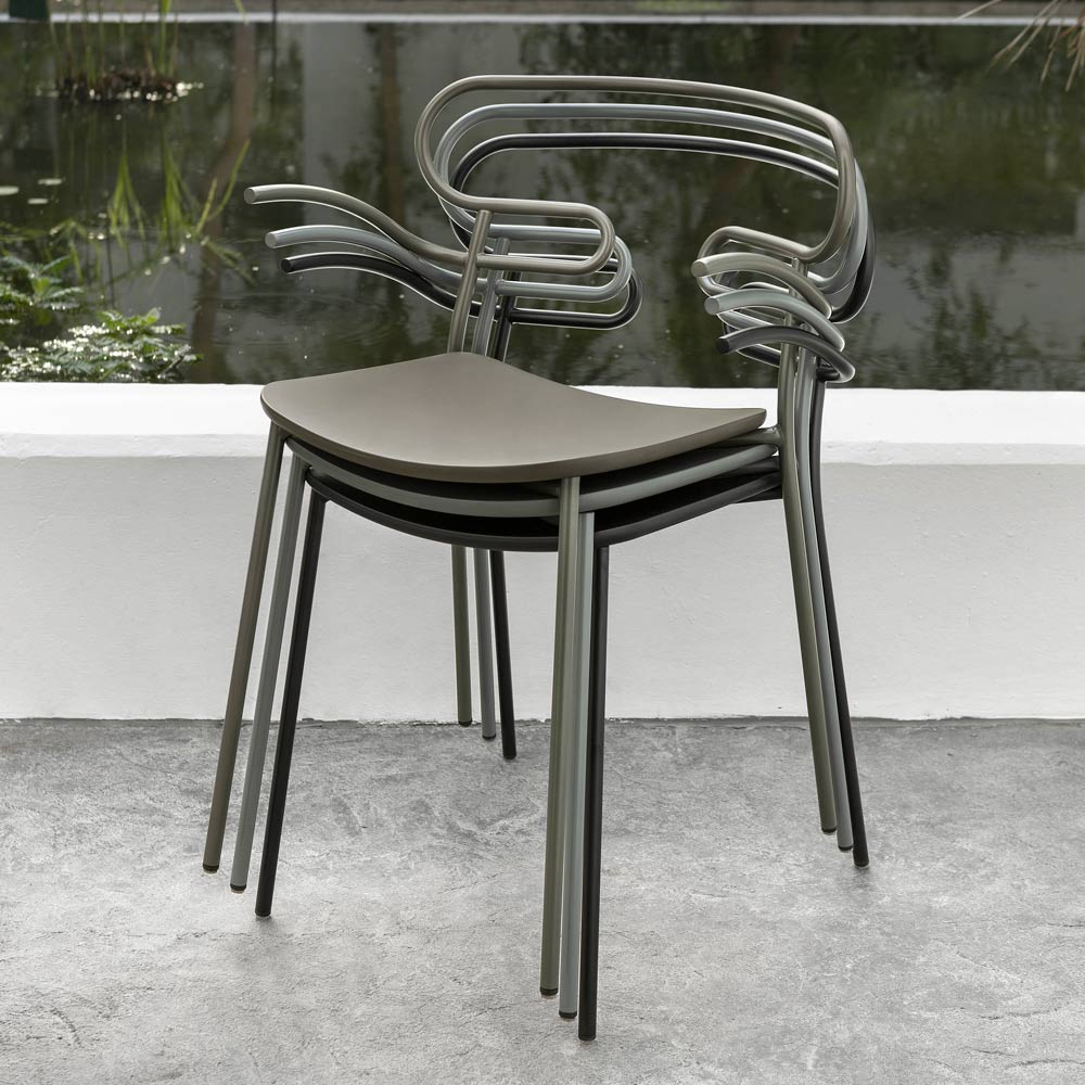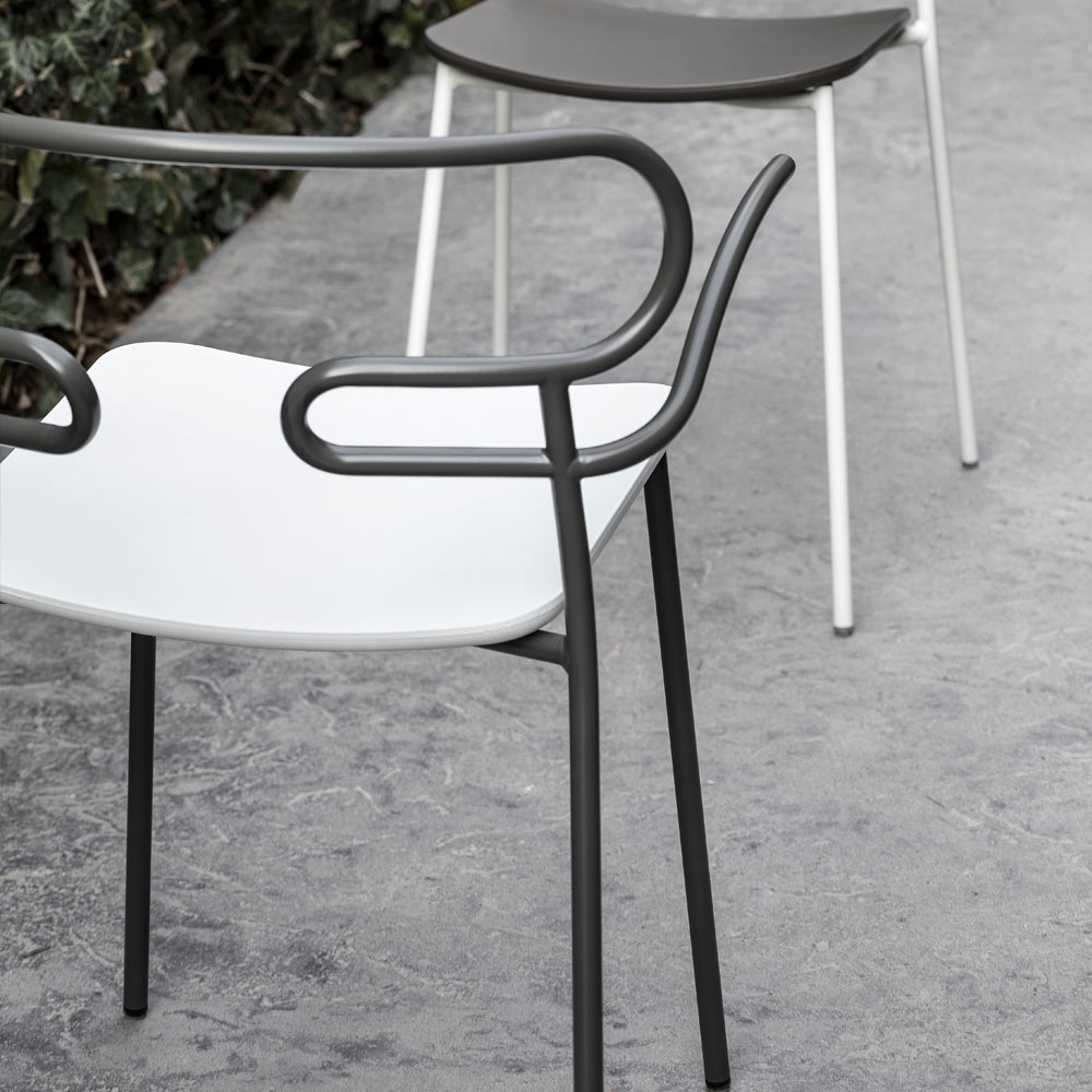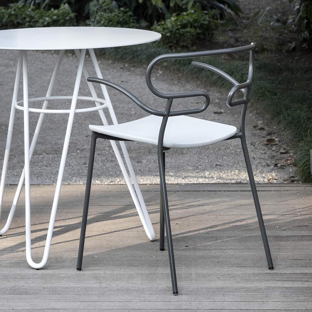 Outdoor chair made in Italy with painted metal structure and polyurethane seat. Simple and essential, this complement stands out thanks to its light lines and the particular shape of the backrest obtained through the curvature of a single metal tube, thus creating an unusual and avant-garde design. Ideal for decorating your outdoor areas with personality such as gardens, verandas and terraces, it has a particularly functional feature that is the possibility of stacking to obtain a practical and easily arranged solution by optimizing your spaces when the chairs are not used.