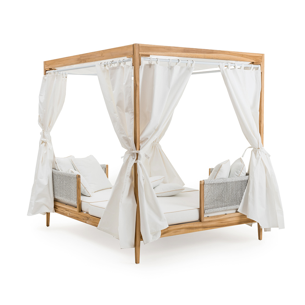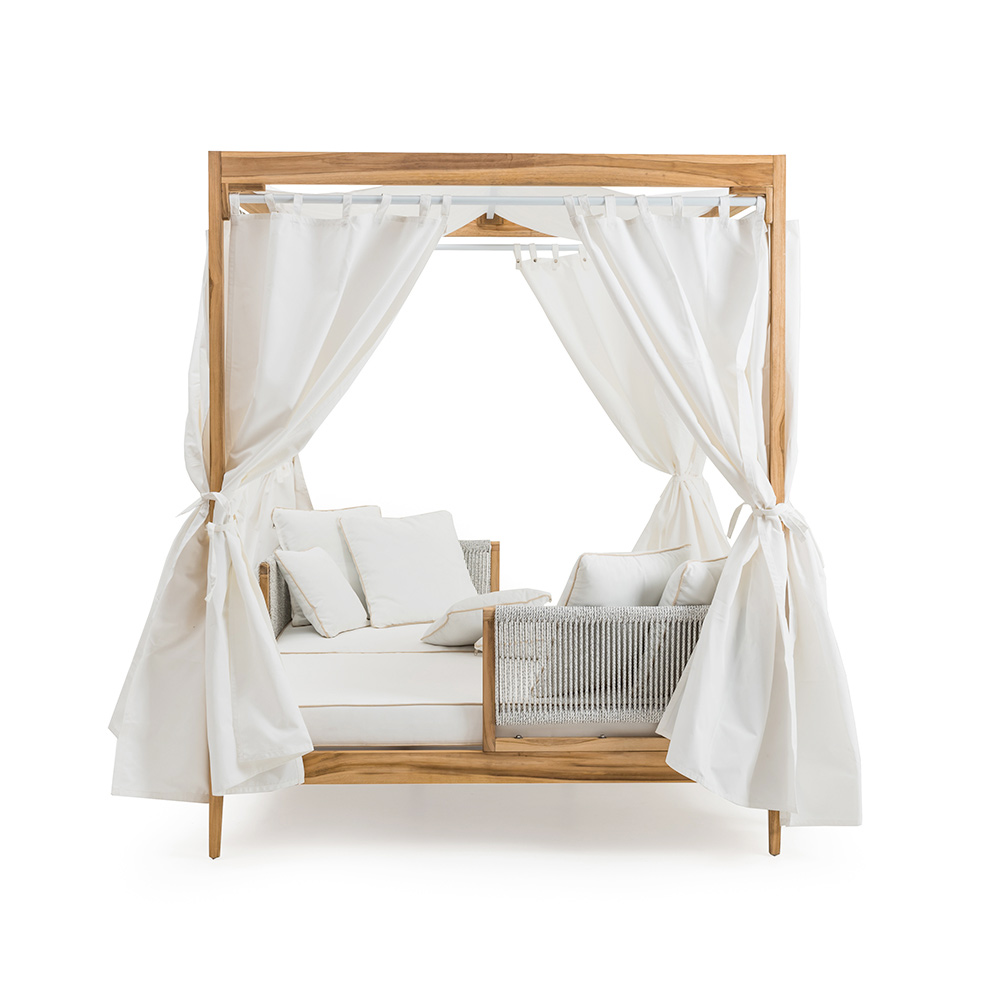 A daybed designed for those seeking a sober and elegant style that can give their outdoor spaces an accent of freshness. This canopy lends itself to impeccably enriching gardens, terraces and porches, also proving perfect by the pool where it creates a wonderful welcoming atmosphere and perfect harmony with the surrounding environment. Its refined design makes it a perfect complement to complete with character and style any outdoor space, both private and contract, giving life to an exclusive and detailed furnishing .