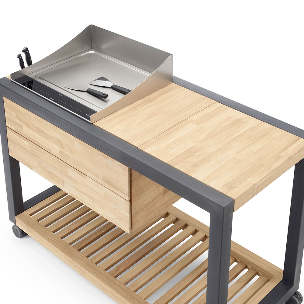 This outdoor kitchen represents the perfect blend of functionality and contemporary design, ideal for turning your every outdoor moment into a unique experience. The powder-coated aluminum frame offers robustness and weather resistance, while the high-quality solid teak inserts treated with Rubio Monocoat Hybrid Wood Protector add a touch of natural elegance and visual warmth.