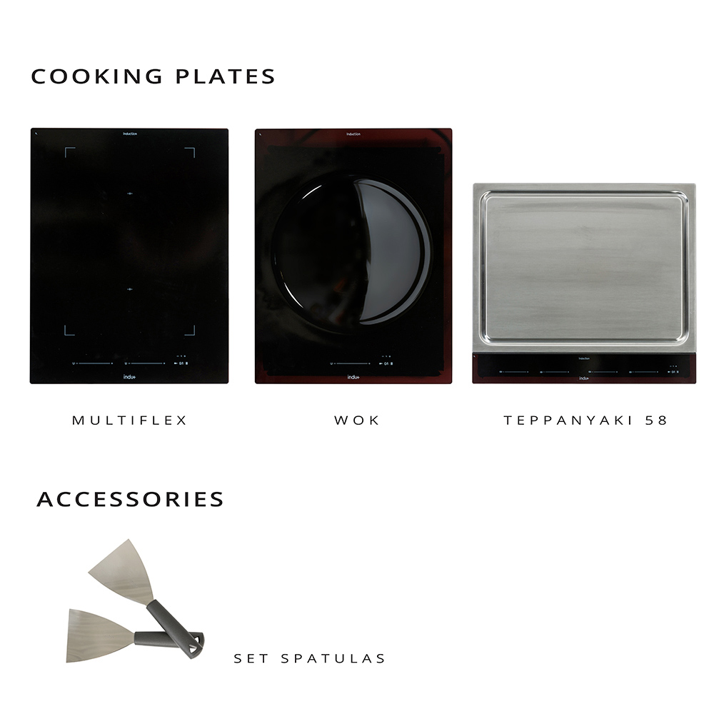 TEPPANYAKI 38/58: state-of-the-art induction technology - locking touch - Stop & go function - 2 independent thermostatically controlled cooking areas (front and rear) — each 1400 W - touch slider control with direct access to each of 10 heating levels: 0-9 / cleaning level - dynamic temperature display for both cooking zones - cleaning touches dedicated to each zone