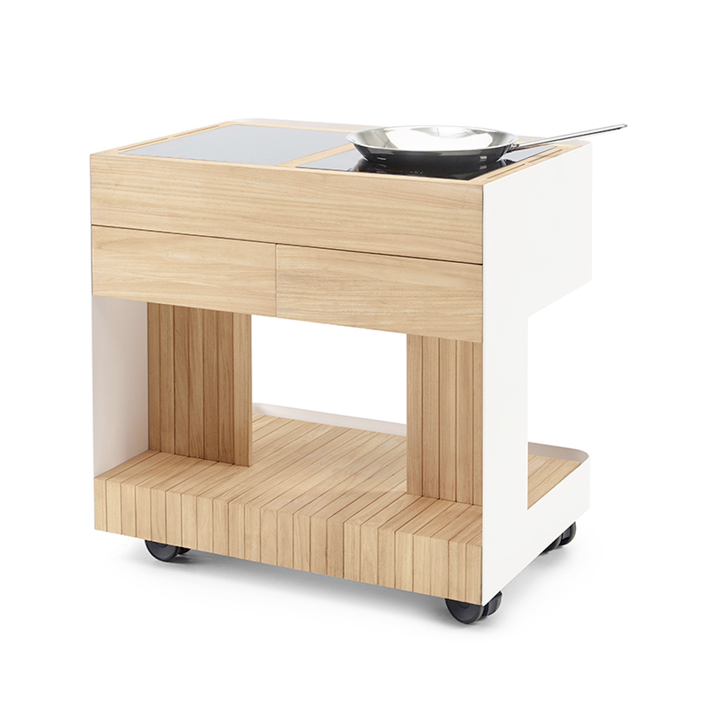 This outdoor kitchen represents the perfect blend of functionality and contemporary design, ideal for turning your every outdoor moment into a unique experience. The powder-coated aluminum frame offers robustness and weather resistance, while the high-quality solid teak inserts treated with Rubio Monocoat Hybrid Wood Protector add a touch of natural elegance and visual warmth.