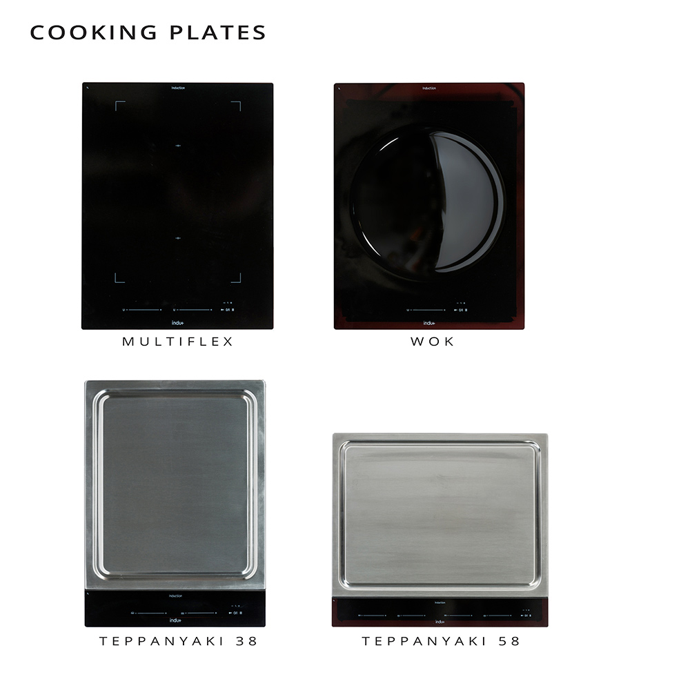 TEPPANYAKI 38: state-of-the-art induction technology - locking touch - Stop & go function - 2 independent thermostatically controlled cooking areas (front and rear) — each 1400 W - touch slider control with direct access to each of 10 heating levels: 0-9 / cleaning level - dynamic temperature display for both cooking zones - cleaning touches dedicated to each zone
