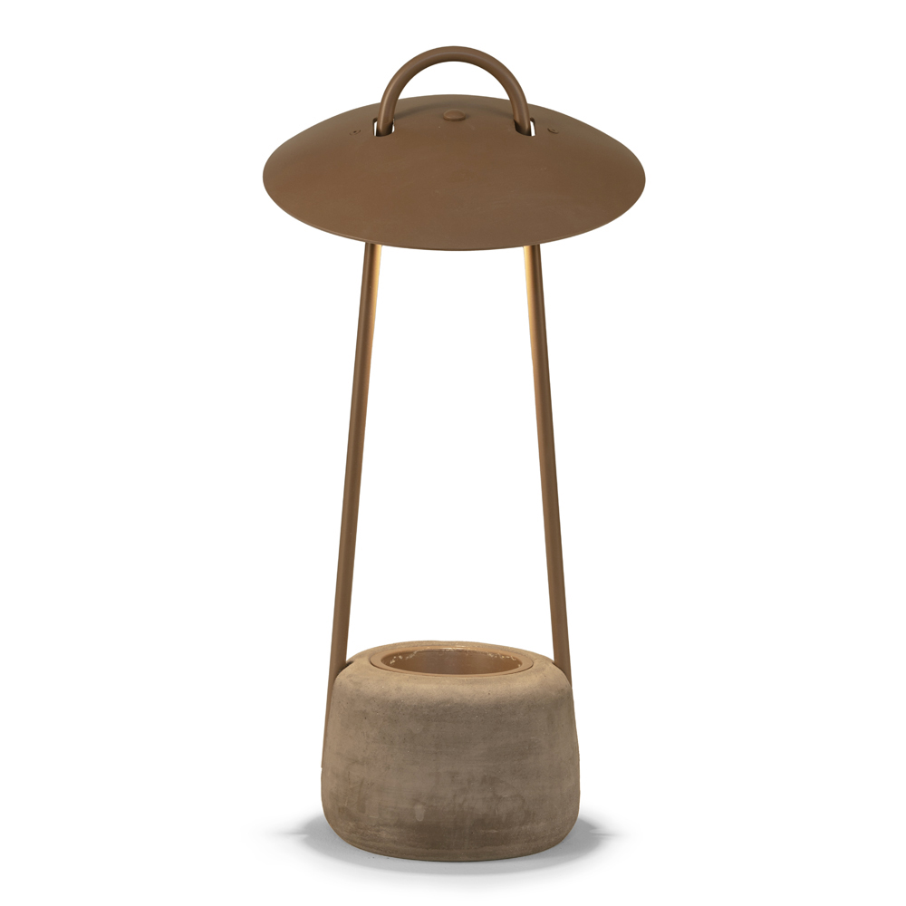 The simple yet refined design, with a clay base that acts as a vase, perfectly matches the elegant metal structure that supports a minimalist lampshade. This combination not only illuminates your environment but also creates a green corner, ideal for small plants or aromatic herbs.