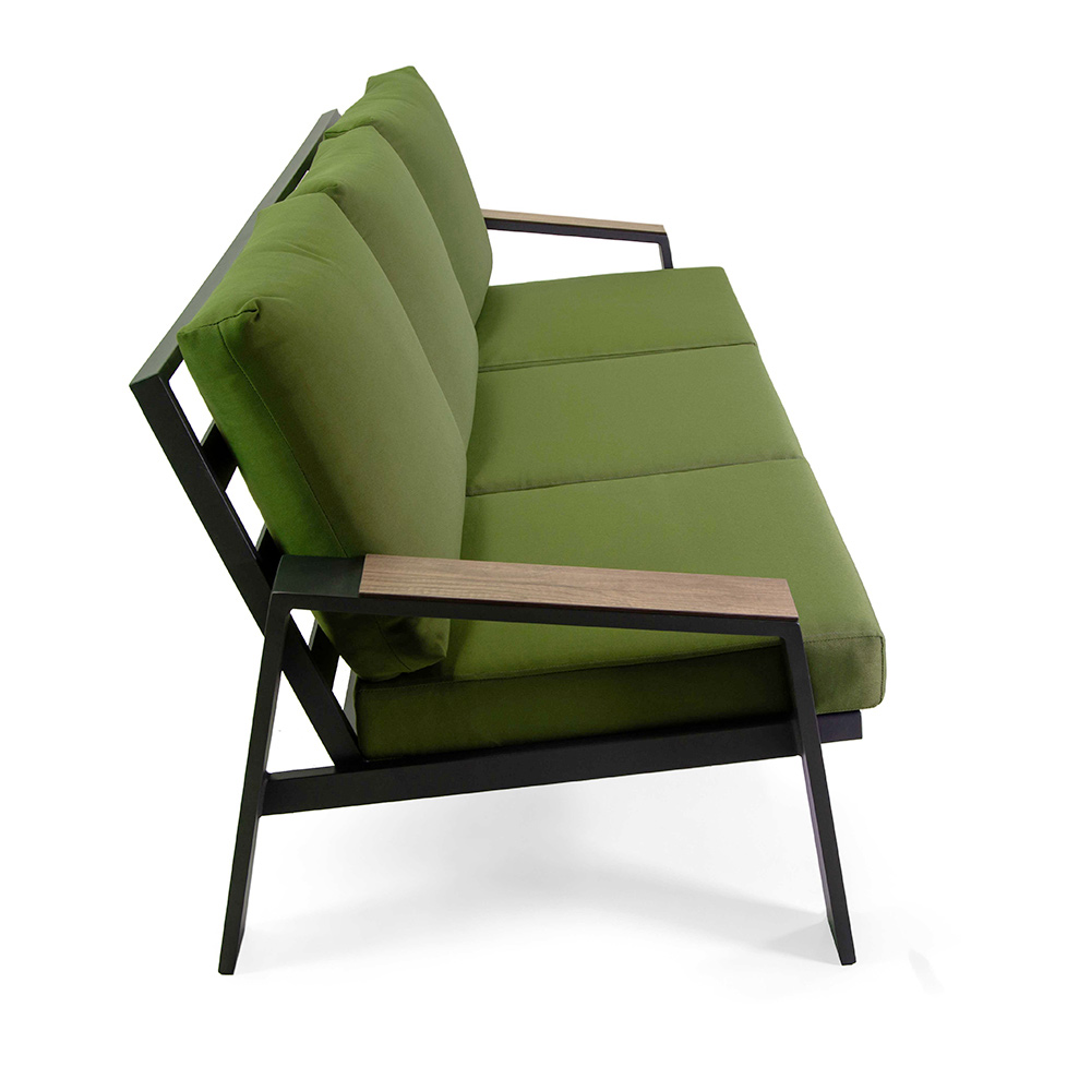 1 3-seater sofa : frame in rust-proof aluminium, powder-coated in anthracite, cushions in water-repellent olefin 203g/m², green, thickness 12 cm and inserts in the armrests in HPL, thickness 6 mm.