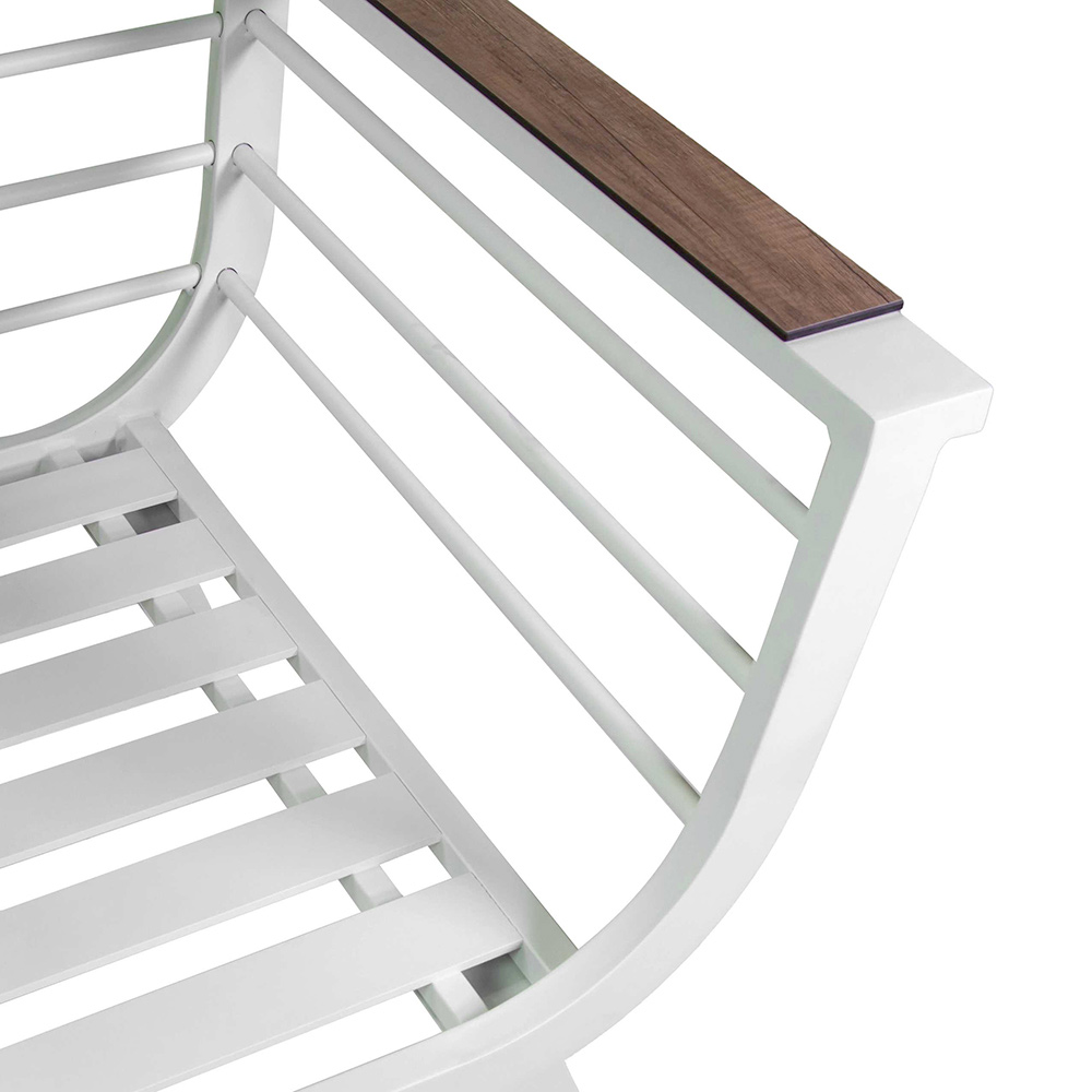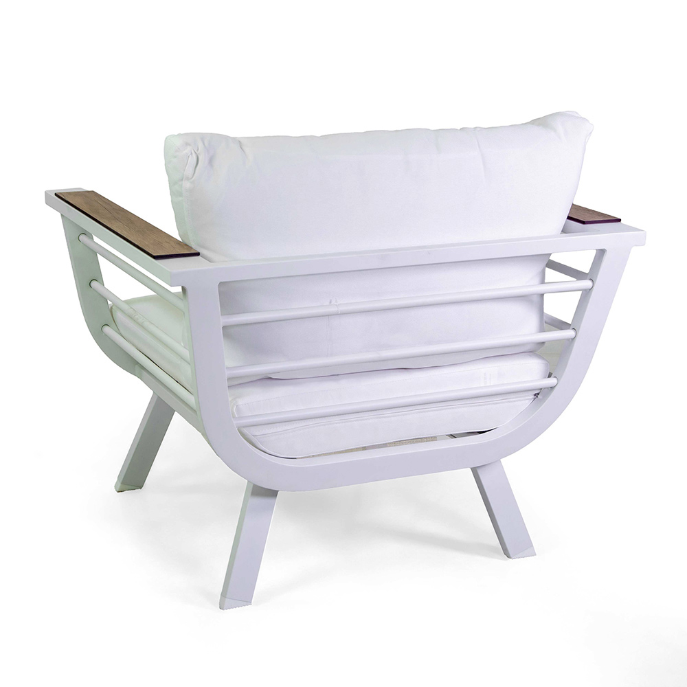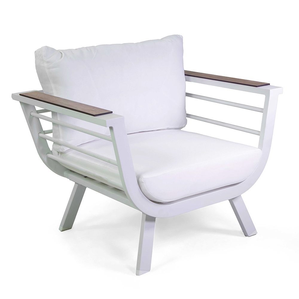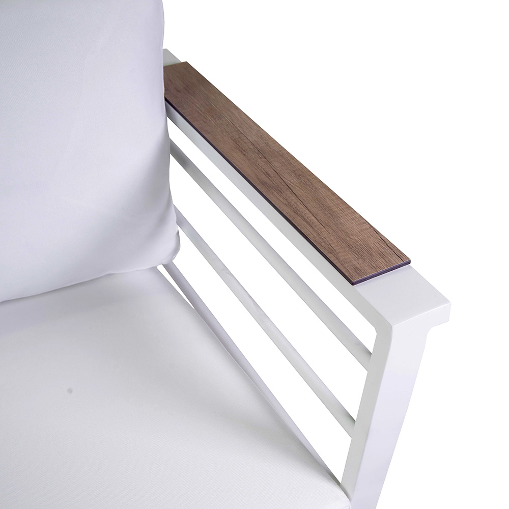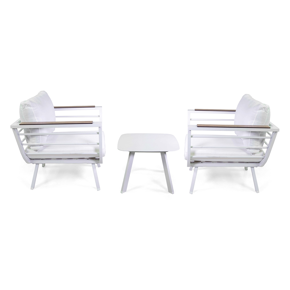 Discover modern elegance and comfort with this white powder-coated aluminum lounge set . Perfect for adding a touch of class to your outdoor space, this set includes two armchairs with 12 cm thick removable cushions in 100% water-repellent Olifen fabric, ensuring comfort and durability. The HPL armrest inserts add a touch of style and practicality, while the white aluminum -top table is sturdy and easy to maintain.