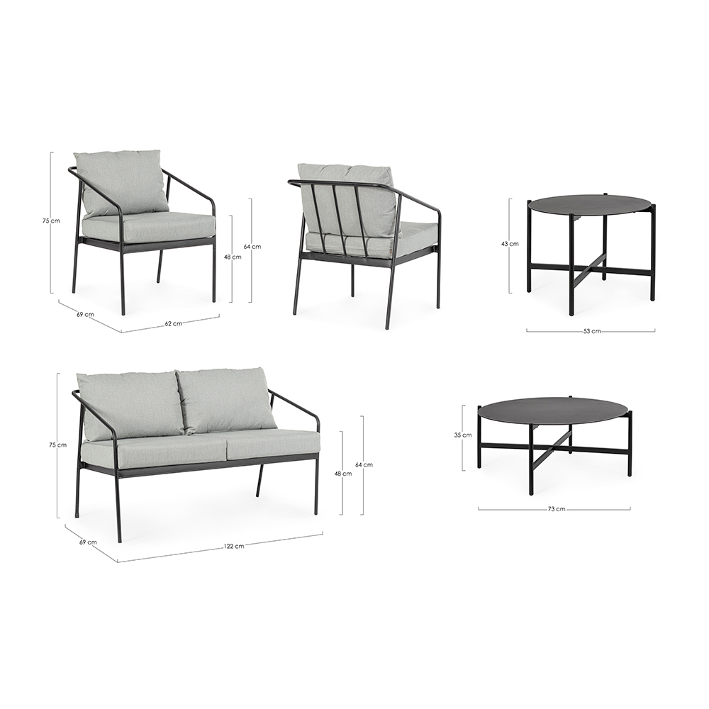 Outdoor lounge with steel structure treated for outdoor use through phosphating and painted powder coated (polyester) and seat and back cushions in spun poly fabric (100% polyester) . It is composed of 1 sofa, 2 coffee tables and 2 armchairs.