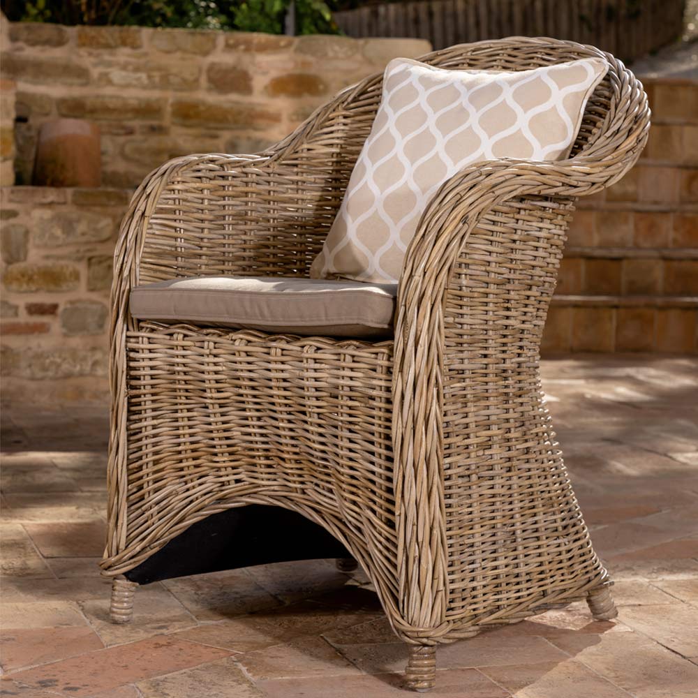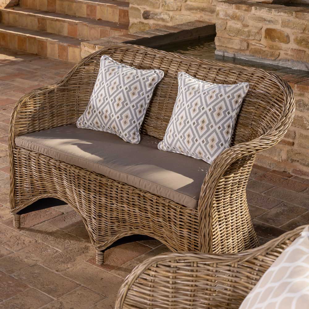 Outdoor lounge set consisting of 2 armchairs , sofa and coffee table in hand-woven kubu with standard seat cushions included in the standard " Grey " finish. Kubu is a natural material among the most resistant among those that can be found in nature, but which always remains very light .