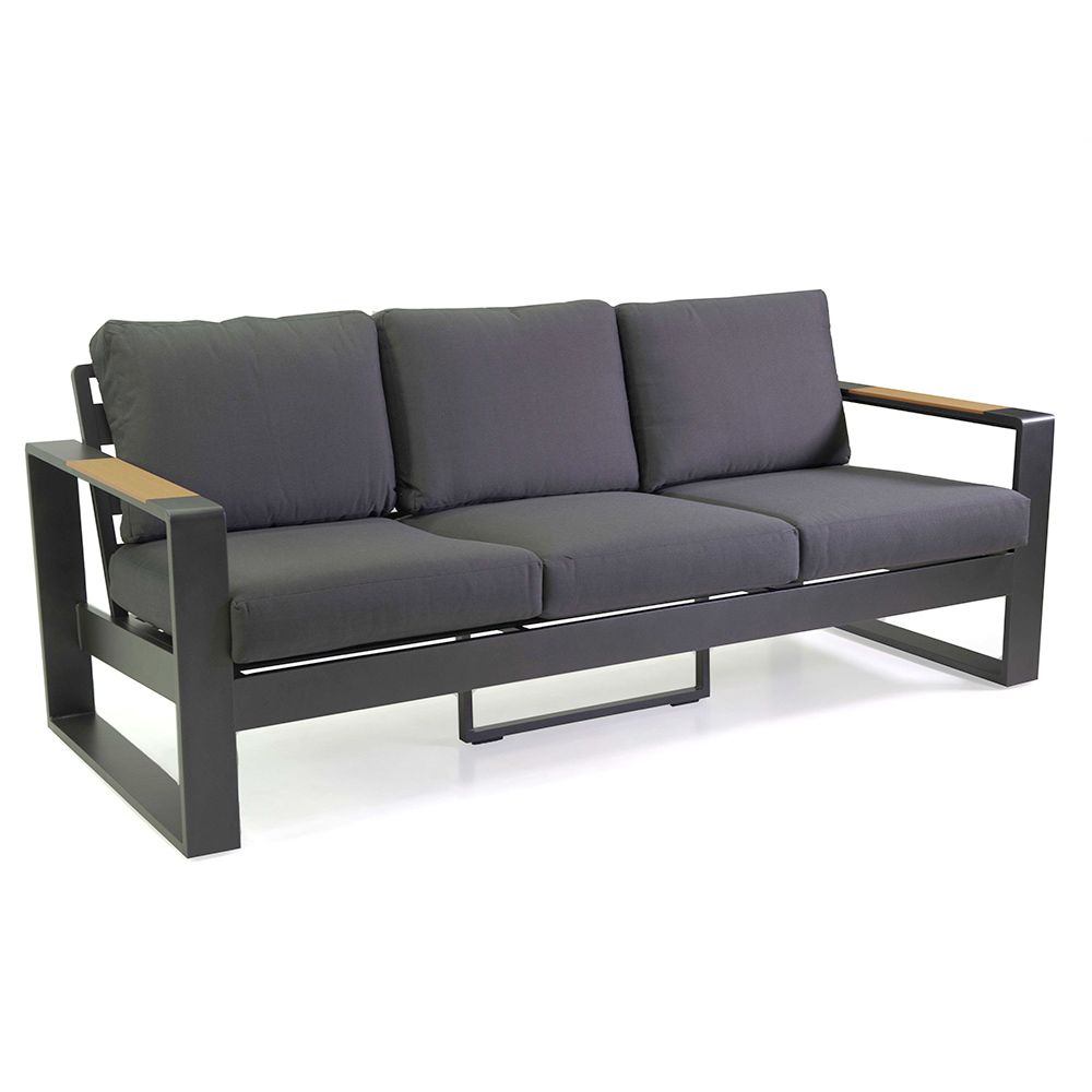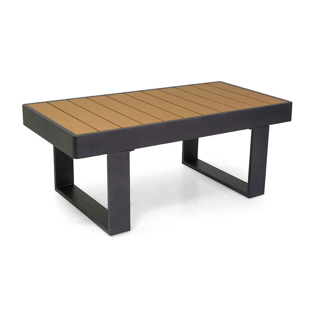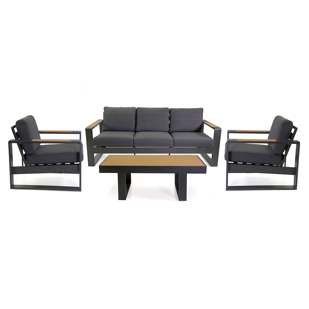 The wooden armrests add a touch of natural warmth that contrasts beautifully with the frame, creating an inviting atmosphere for relaxing or entertaining. The matching coffee table is perfect for keeping drinks and snacks close at hand, making this set an excellent choice for any patio or garden.