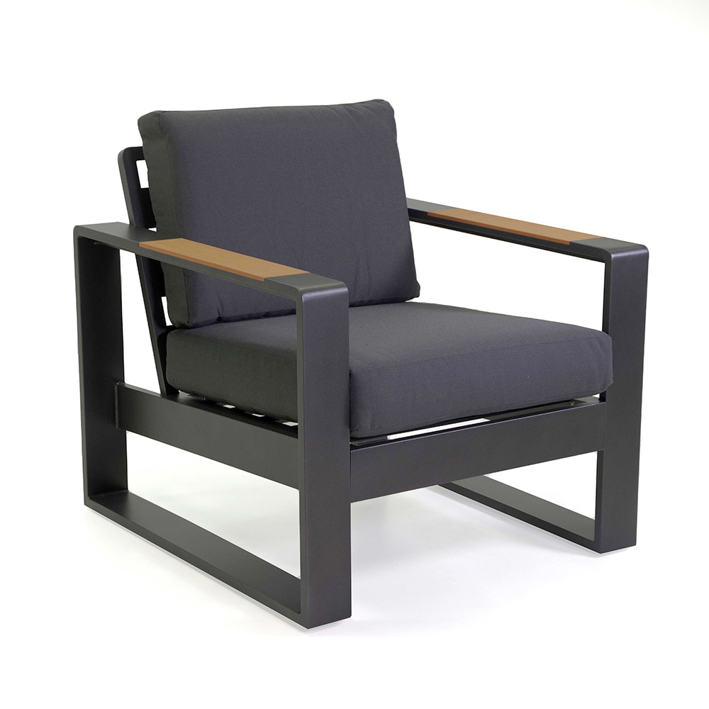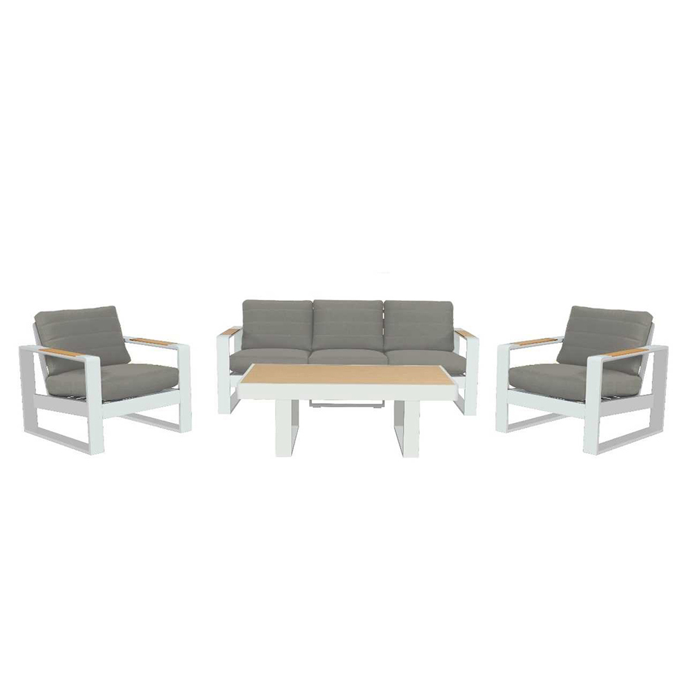 This elegant lounge set is the perfect combination of style and comfort . Featuring clean queues and a contemporary design, it offers a refined and welcoming solution for any outdoor space. The combination of corrosion-resistant aluminum and soft cushions in high-quality fabric ensures durability and easy maintenance , making it ideal for everyday use.