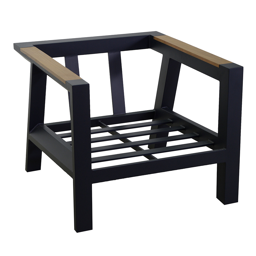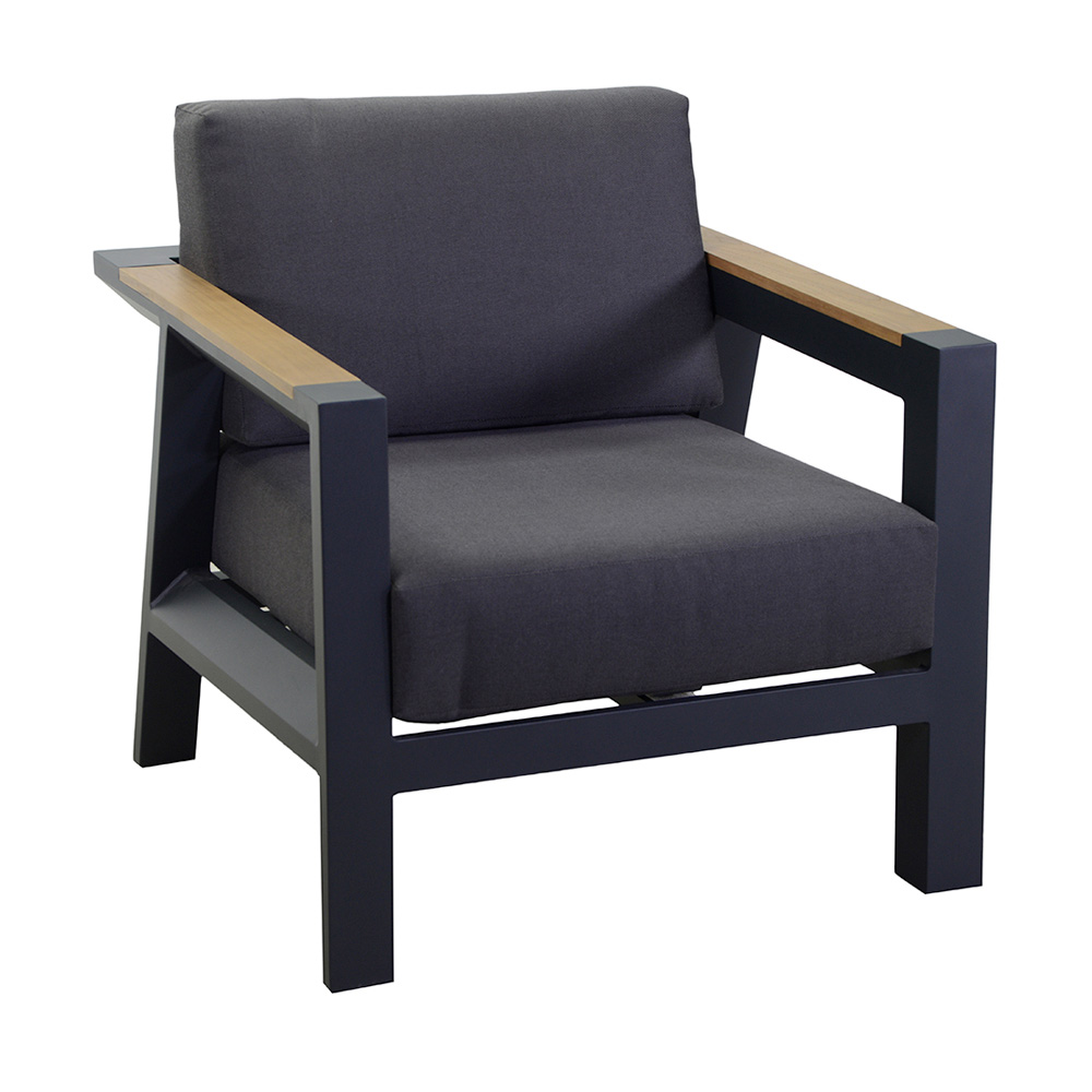 2 armchairs: frame in rustproof powder-coated aluminium in anthracite, water-repellent cushions in dark grey polyester, removable covers and armrests in TEAK wood from Brazil