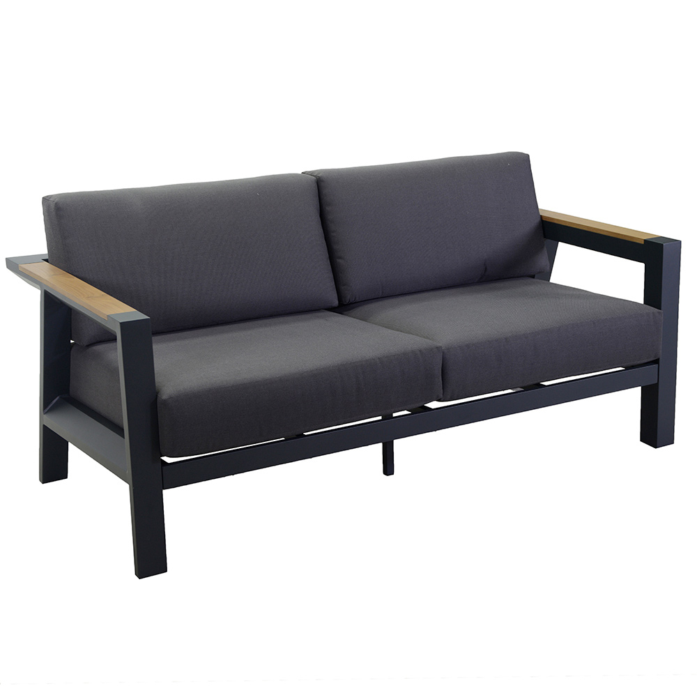 1 sofa: frame in rustproof powder-coated aluminium in anthracite, water-repellent cushions in dark grey polyester, removable covers and armrests in TEAK wood from Brazil