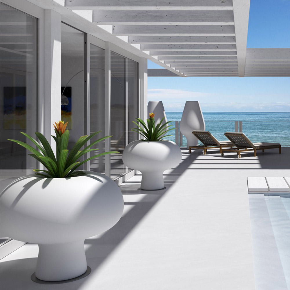 Luminous garden vase made entirely in Italy in opaque finish polyethylene complete with LED light kit. A totemic complement with imposing shapes that recalls the stylized figure of a floral element. Its aesthetic creates settings of great emotional impact, evoking the image of an oversized lawn to give life to an original and at the same time elegant atmosphere with refined minimalism. Thanks to the LED lighting it is particularly suitable for creating high-impact light points in both classic and contemporary outdoor environments such as gardens, terraces, porches or open contract spaces. Complete with stabilization and fixing base.