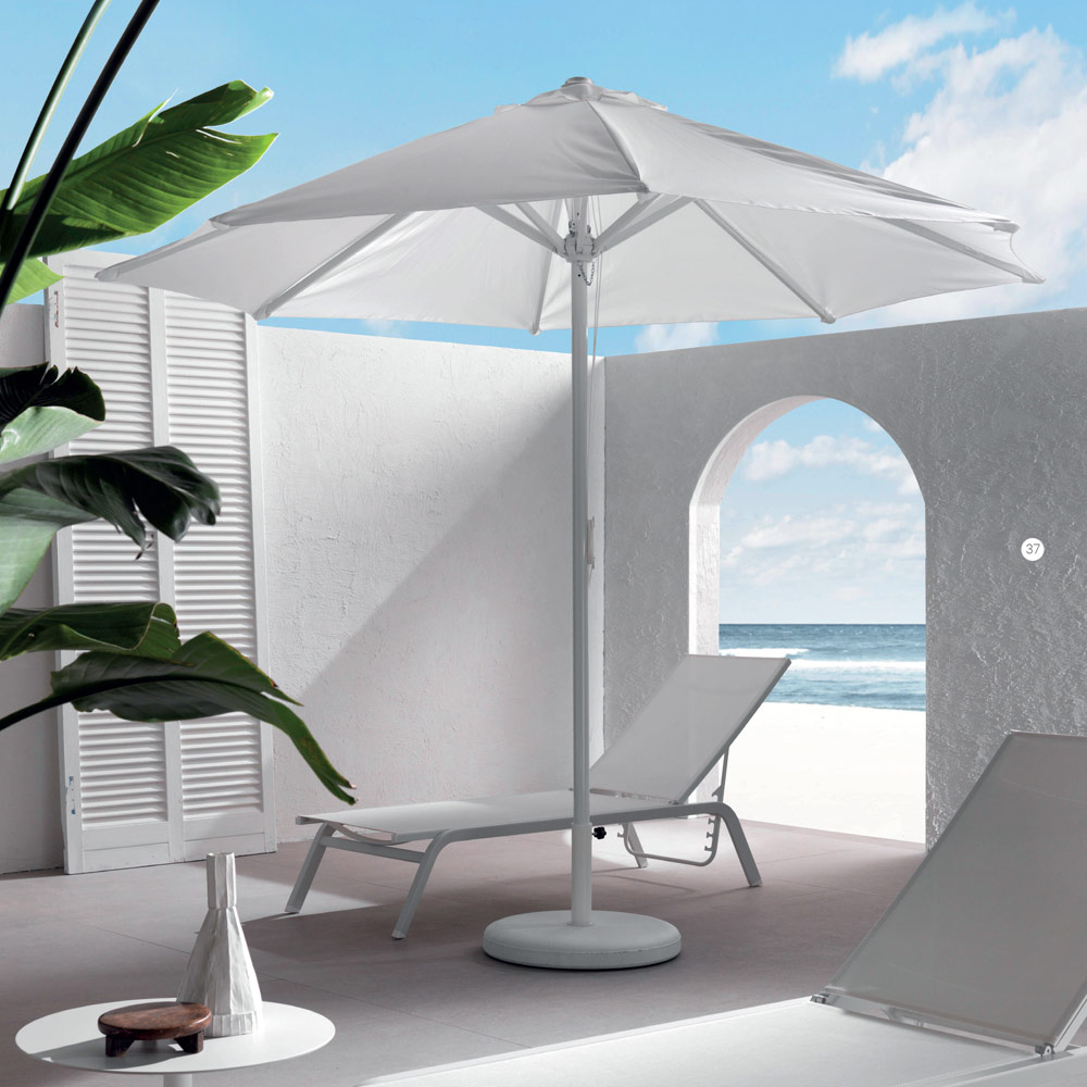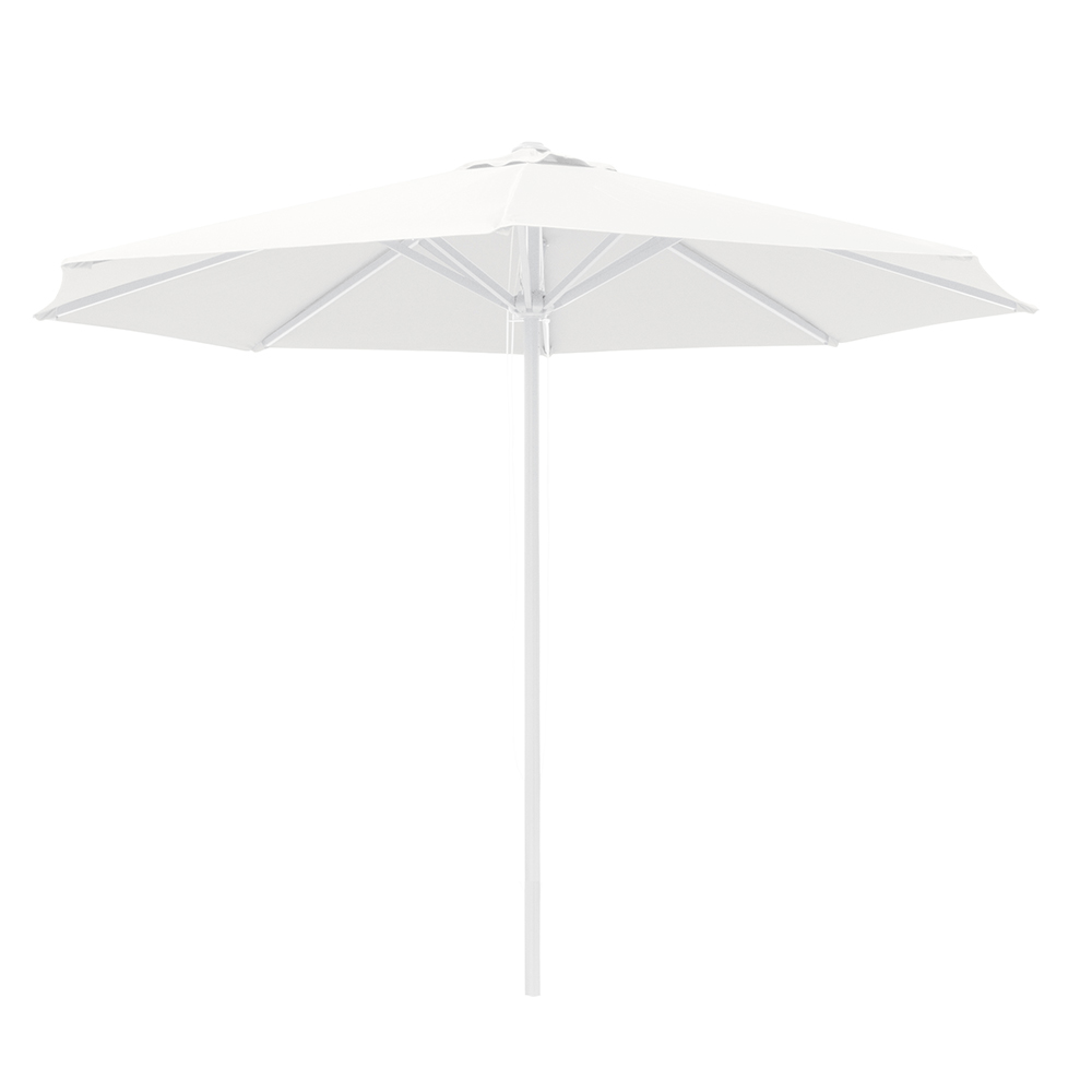 Outdoor umbrella with aluminium structure and acrylic fabric.