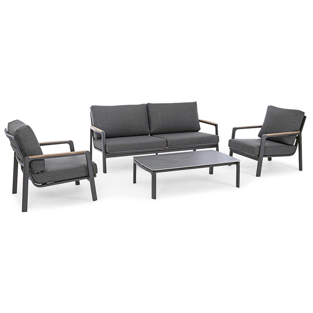 Powder coated aluminum structure (polyester). Armrests with teak inserts. Seat and back cushions with removable covers with acrylic fabric.