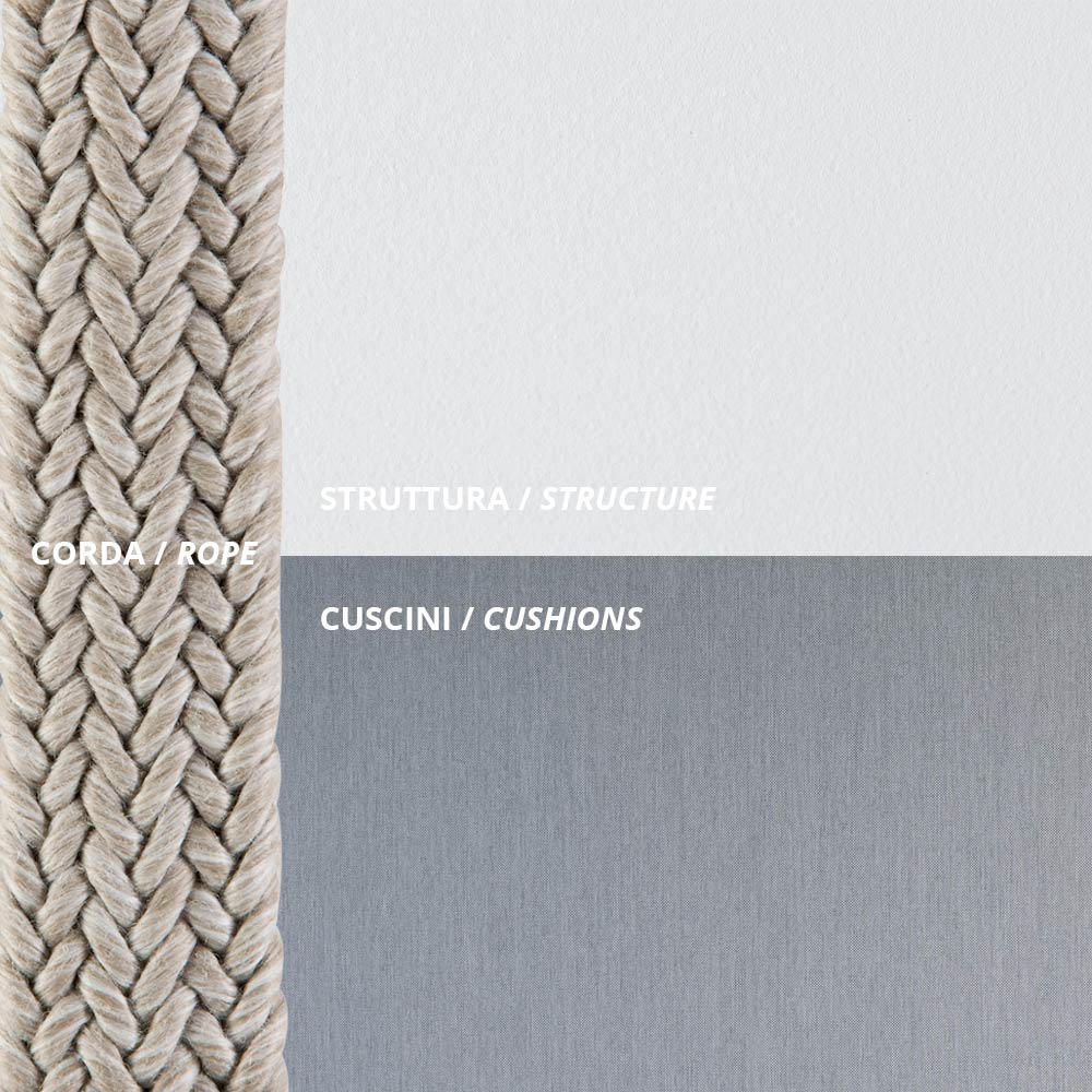 - Frame: embossed white + Rope: mud + Cushions: grey