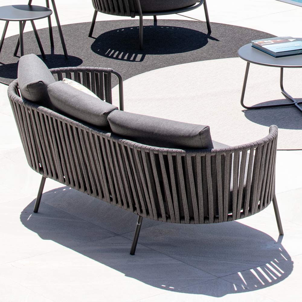 resistance of the material finish to corrosive atmospheric agents while the rope is resistant to chlorine and sunlight as well as anti-mould. The cushions are made with material resistant to UV rays and water that maintains the colour for a long time making the sofa a perfect element to furnish any outdoor environment.