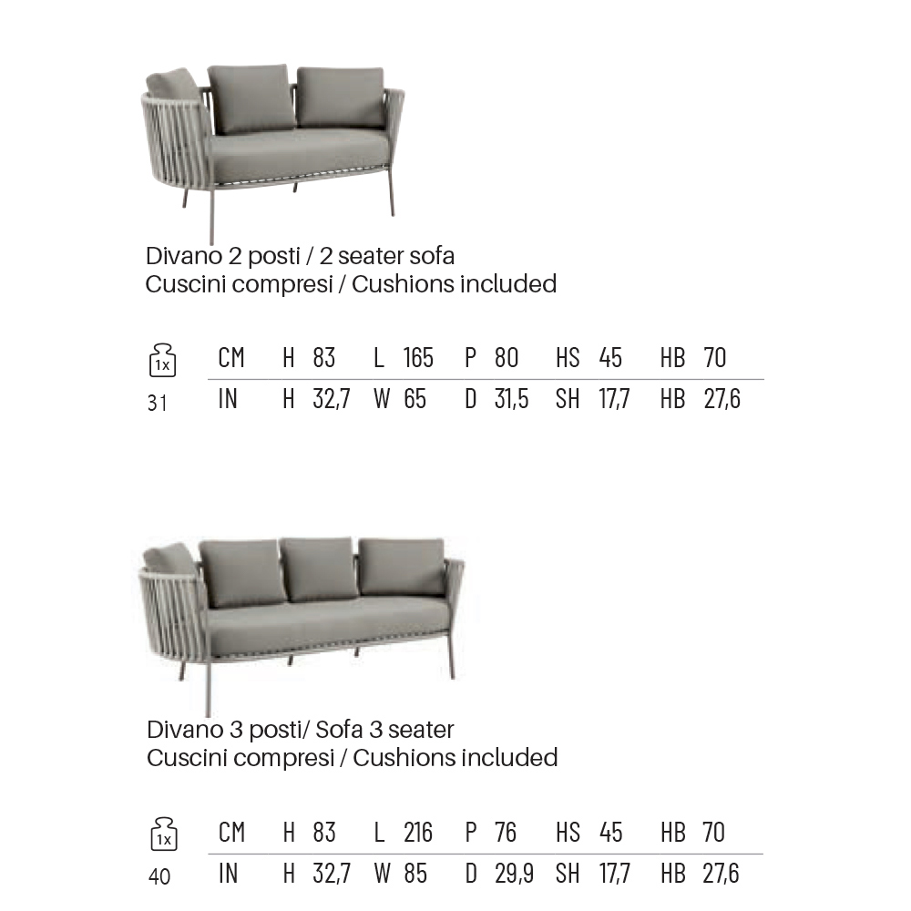 Outdoor sofa in steel and rope of various sizes with cushions Made in Italy.