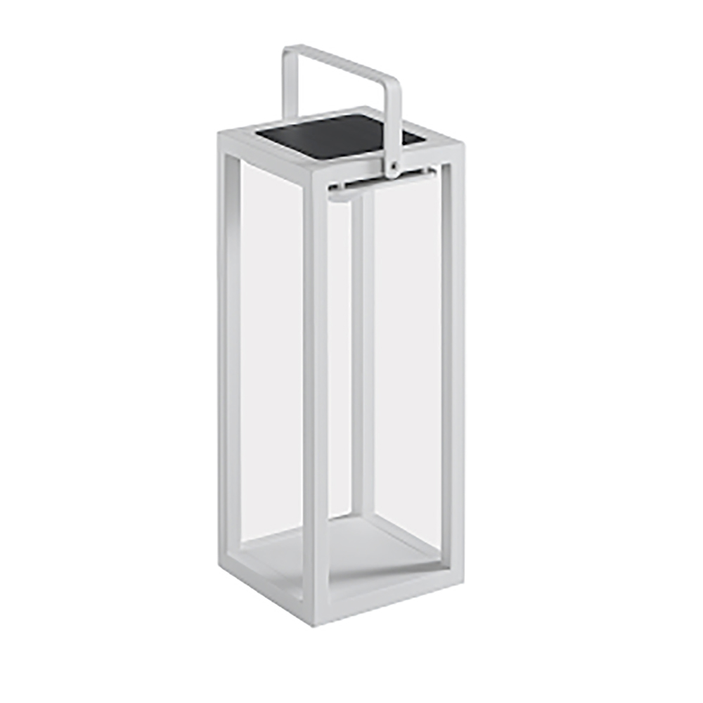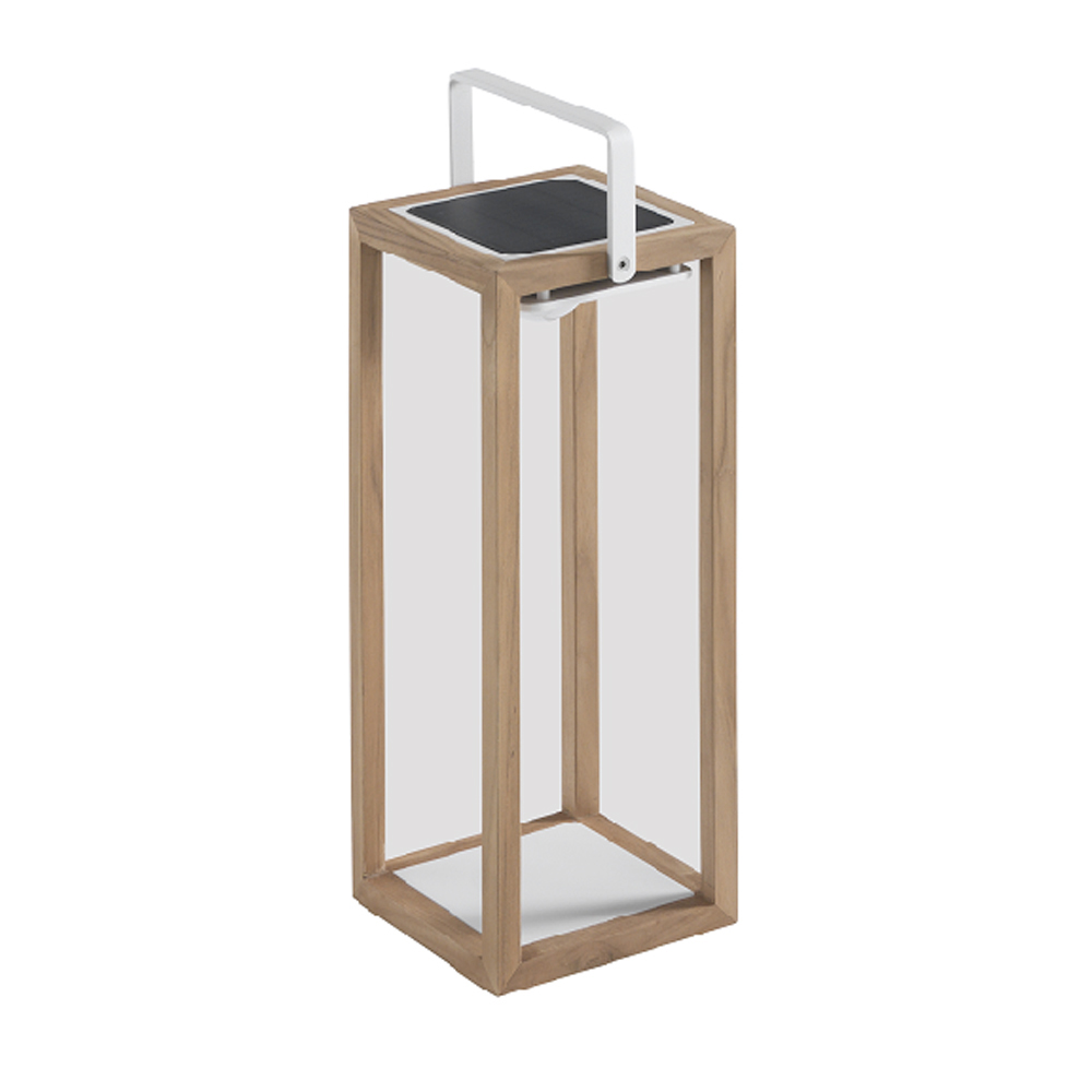 painted aluminium or teak available with white structure and white handle or with teak structure and white handle. The light of the lantern is given by