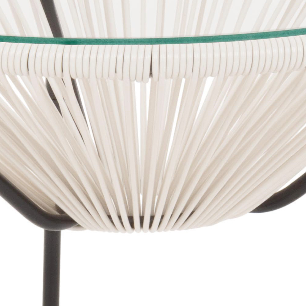 Outdoor design coffee table made of steel, with glass top, garden item.