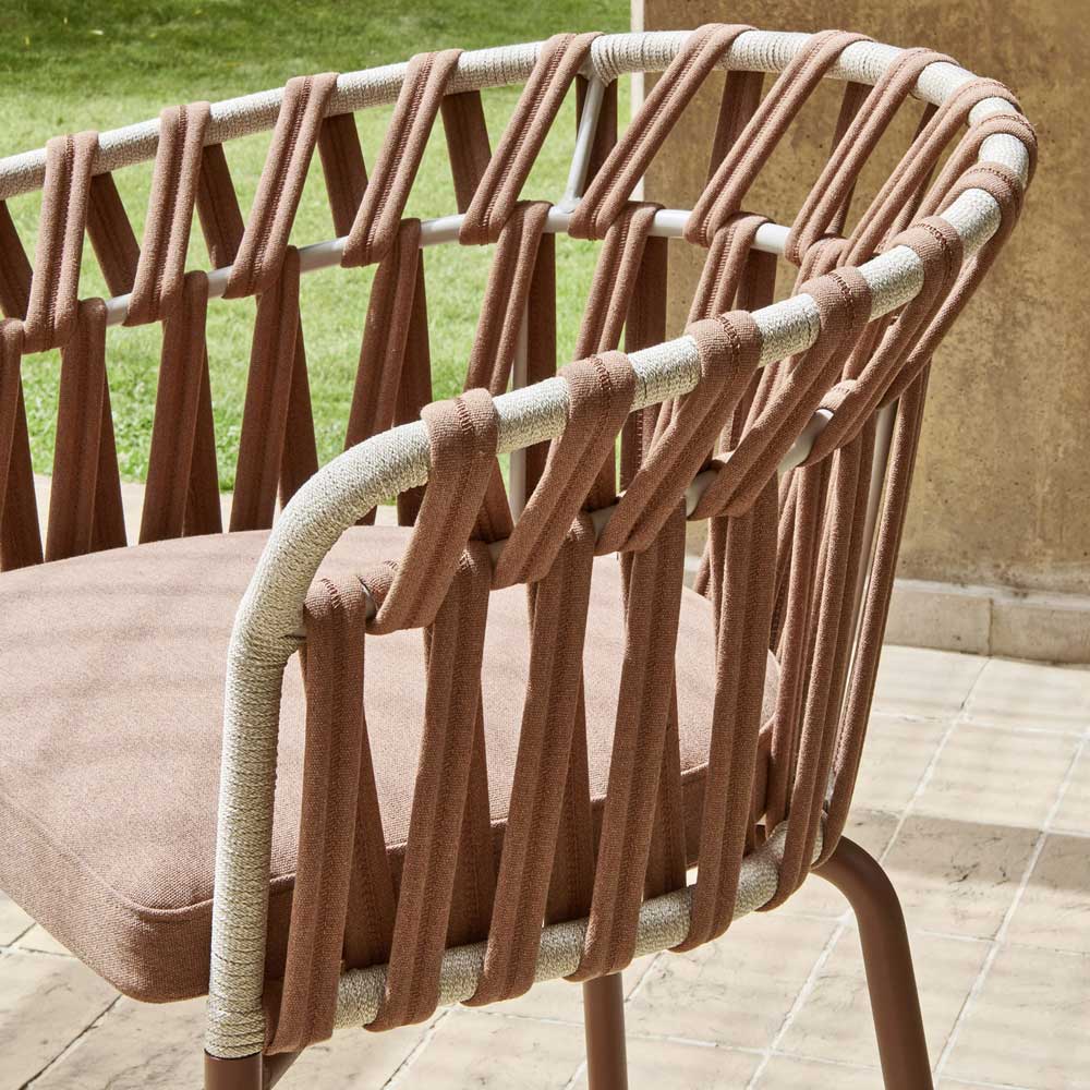 Garden stool with aluminum structure painted with epoxy powder in rust finish, seat in rust-colored removable fabric and back in aluminum enriched with an interweaving of acrylic fabric cords in rust finish, entirely made in Italy . An innovative and fresh furnishing solution, ideal for satisfying the eye thanks to its elegant and modern aesthetics while offering a welcoming and particularly comfortable seat .
