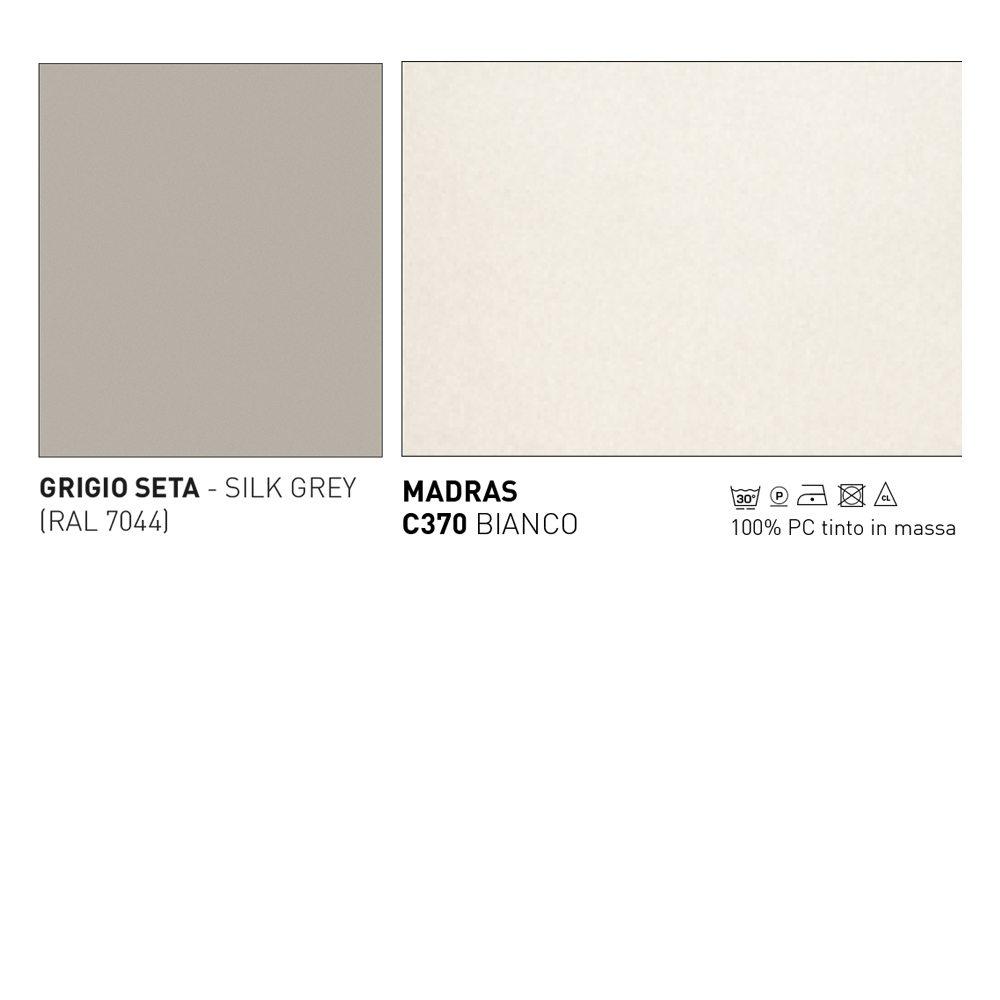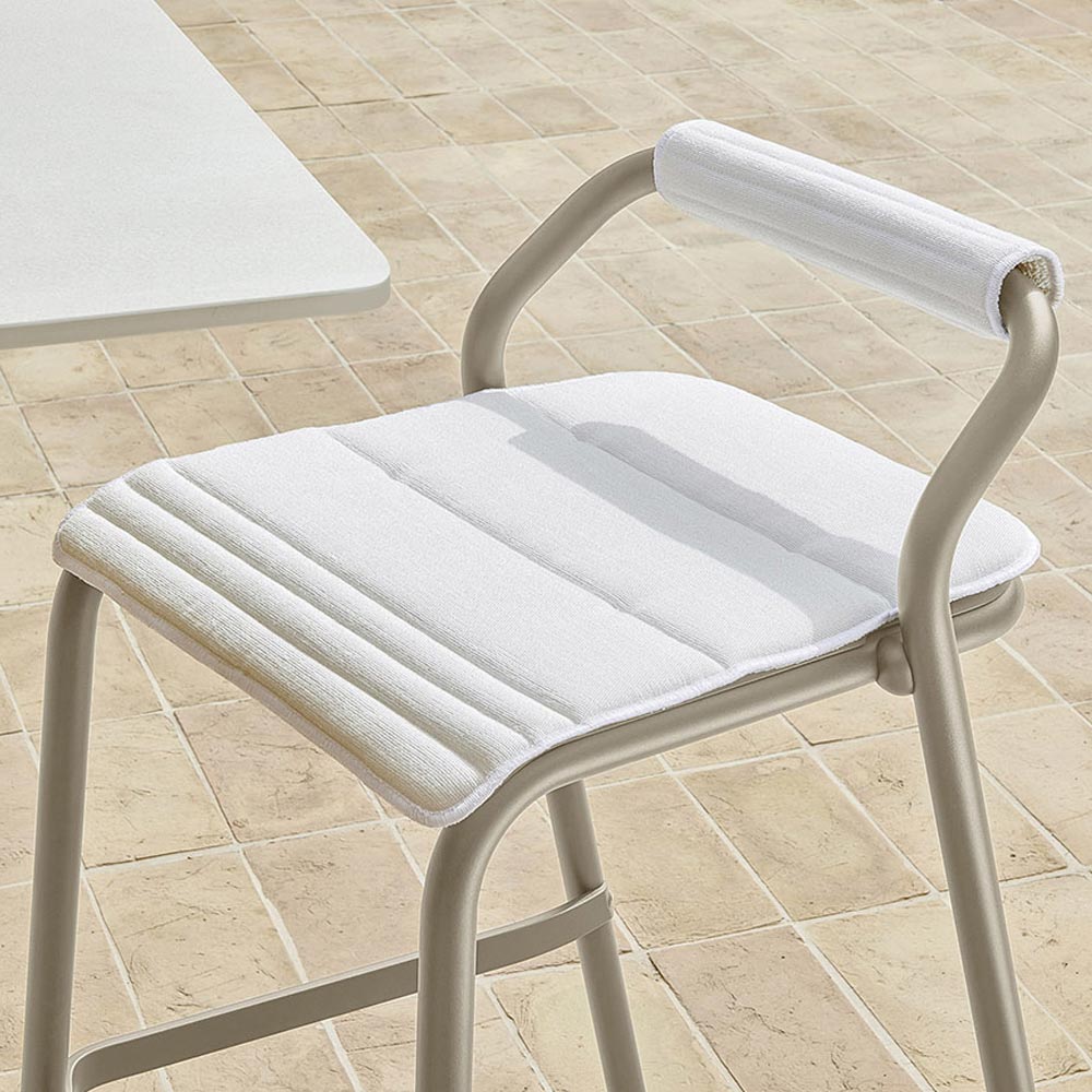Outdoor stool entirely made in Italy with structure in epoxy powder coated aluminum tube in silk grey finish and seat complete with white seat and back cushions padded with dryfeel rubber . This modern piece of furniture is designed to offer optimal comfort while helping to complete the outdoor environment thanks to its elegant aesthetics .