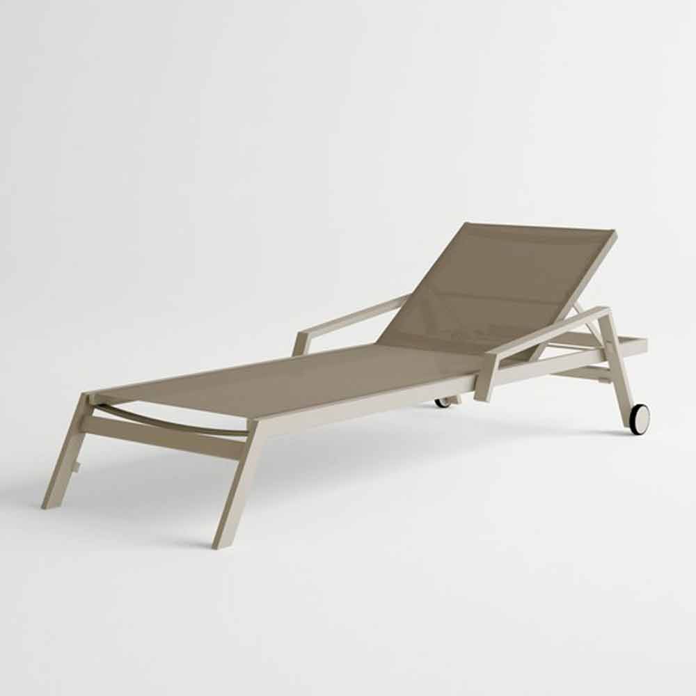 Outdoor sunbed, aluminium and textilene structure, modern design with wheels and armrests.