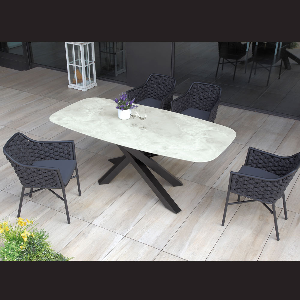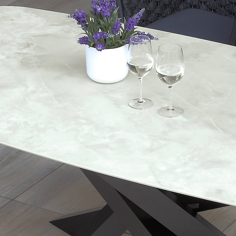 Garden table made with black painted aluminium structure and top in laminated HPL with pearl onyx effect.