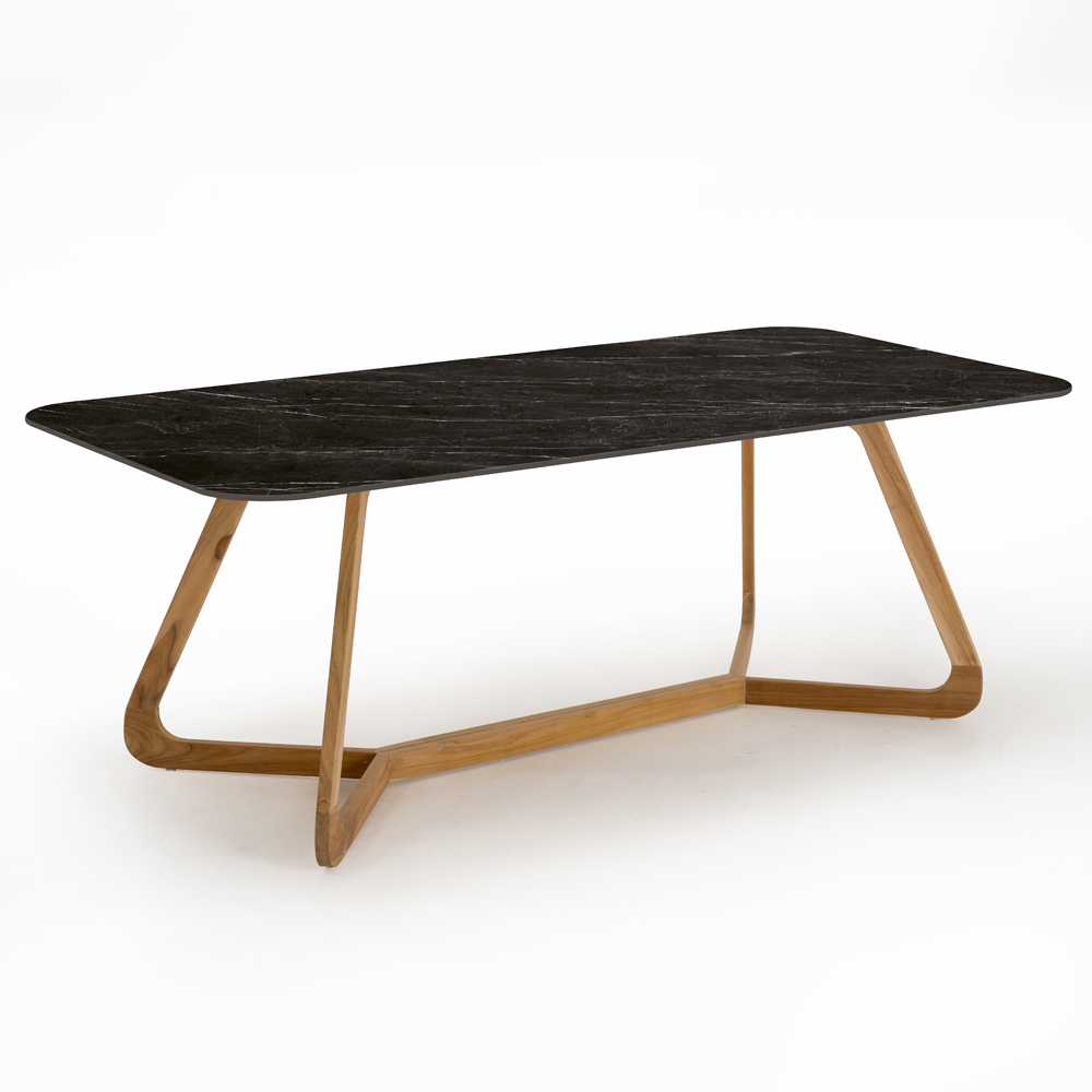 Made in Italy. This outdoor table makes a true statement of style and sophistication for your outdoor space. The ceramic top is inspired by luxurious Nero Marquinia marble, renowned for its intense black colour punctuated by subtle, elegant white veins that create a striking visual contrast.