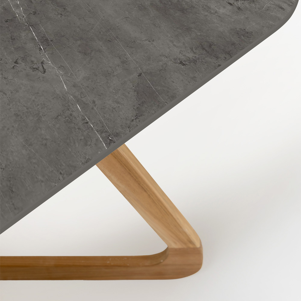 Made in Italy. This Pietra Grey ceramic-topped outdoor table is an excellent choice for those seeking a simple yet impactful design. This table pairs a sturdy wooden base with a ceramic top that perfectly mimics the elegance of grey stone, featuring subtle white veining that adds depth and character to the overall design.