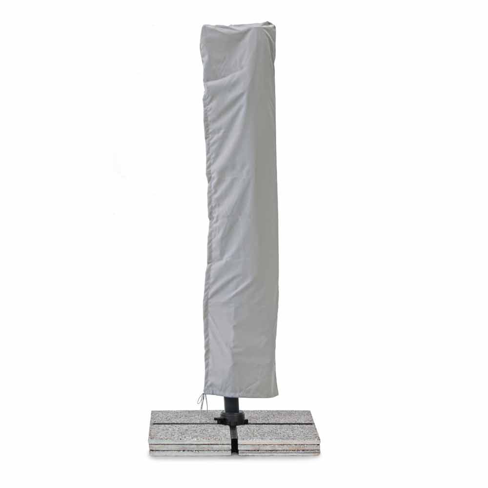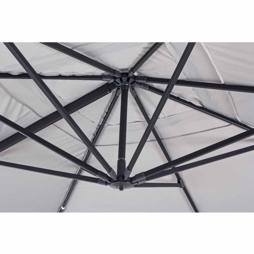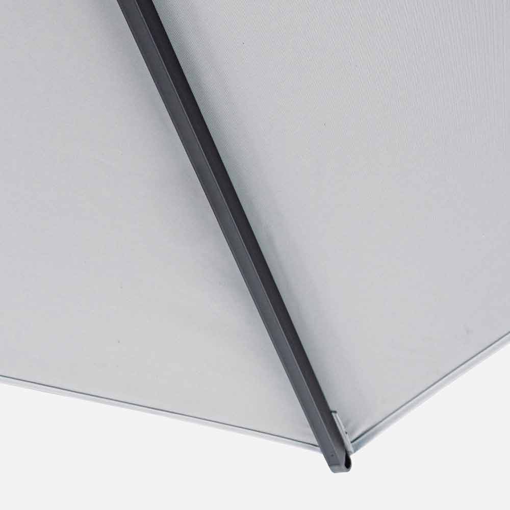 Powder coated aluminum structure (polyester). 93x57mm pole. 8 ribs 28x18mm. Light grey polyester fabric 250gr / m2 with pa (polyamide) coating. Cross base in steel . 360 ° rotating pole with pedal. Vertical inclination with 5-position handle. Including umbrella cover.