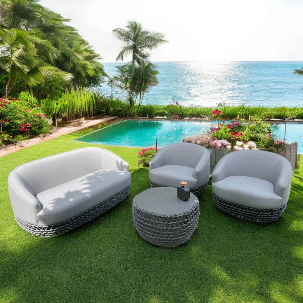 Completed with a matching coffee table featuring the same decorative weave, this lounge set is the ideal choice for creating an elegant oasis of relaxation , perfect for gardens, terraces and verandas.
