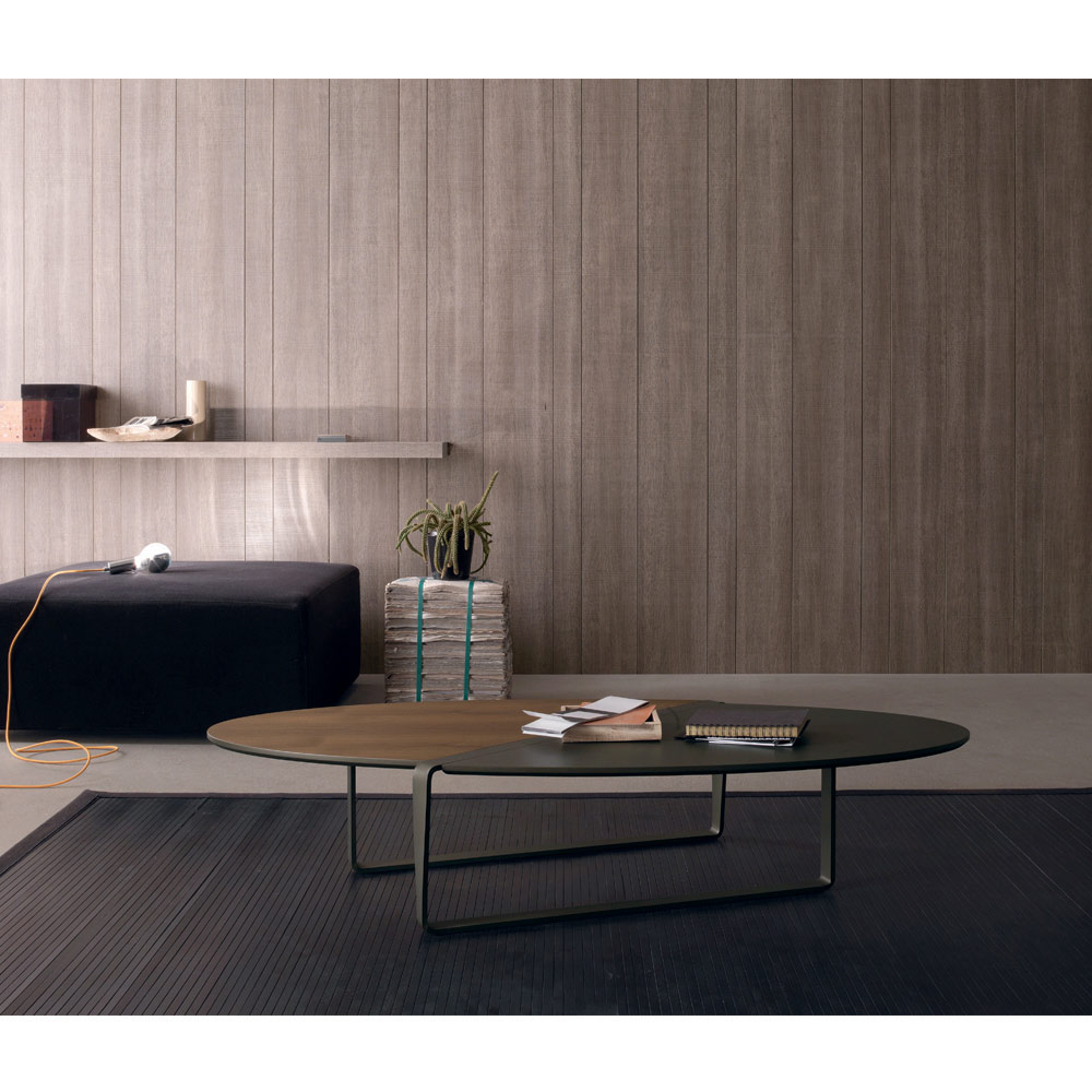 This oval design coffee table features an embossed graphite powder coated metal base and a two-tone wood top in canaletto walnut veneer and metallic bronze lacquered wood .